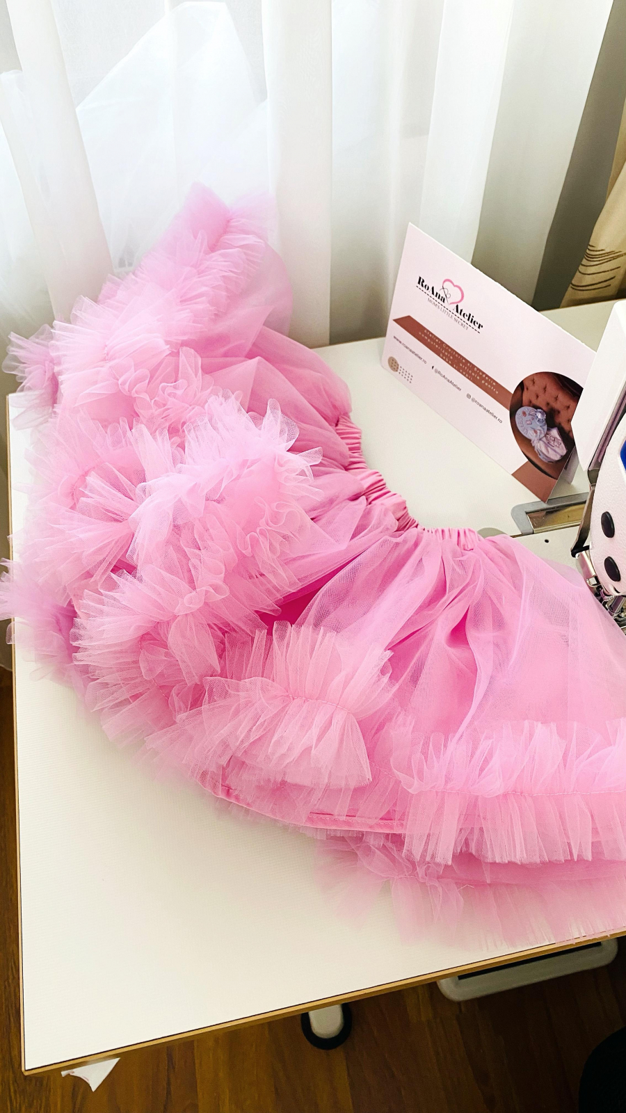 Fustița Tutu Roz cu volanas este o fustiță plină de farmec, cu volum, realizată din tulle moale într-o nuanță dulce de roz, cu elastic in talie.