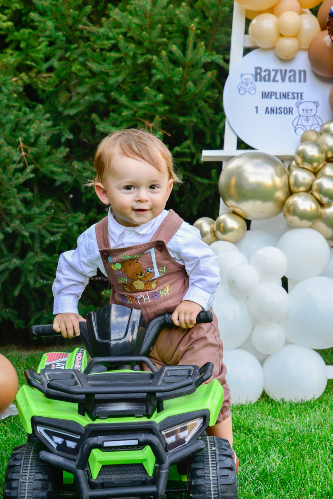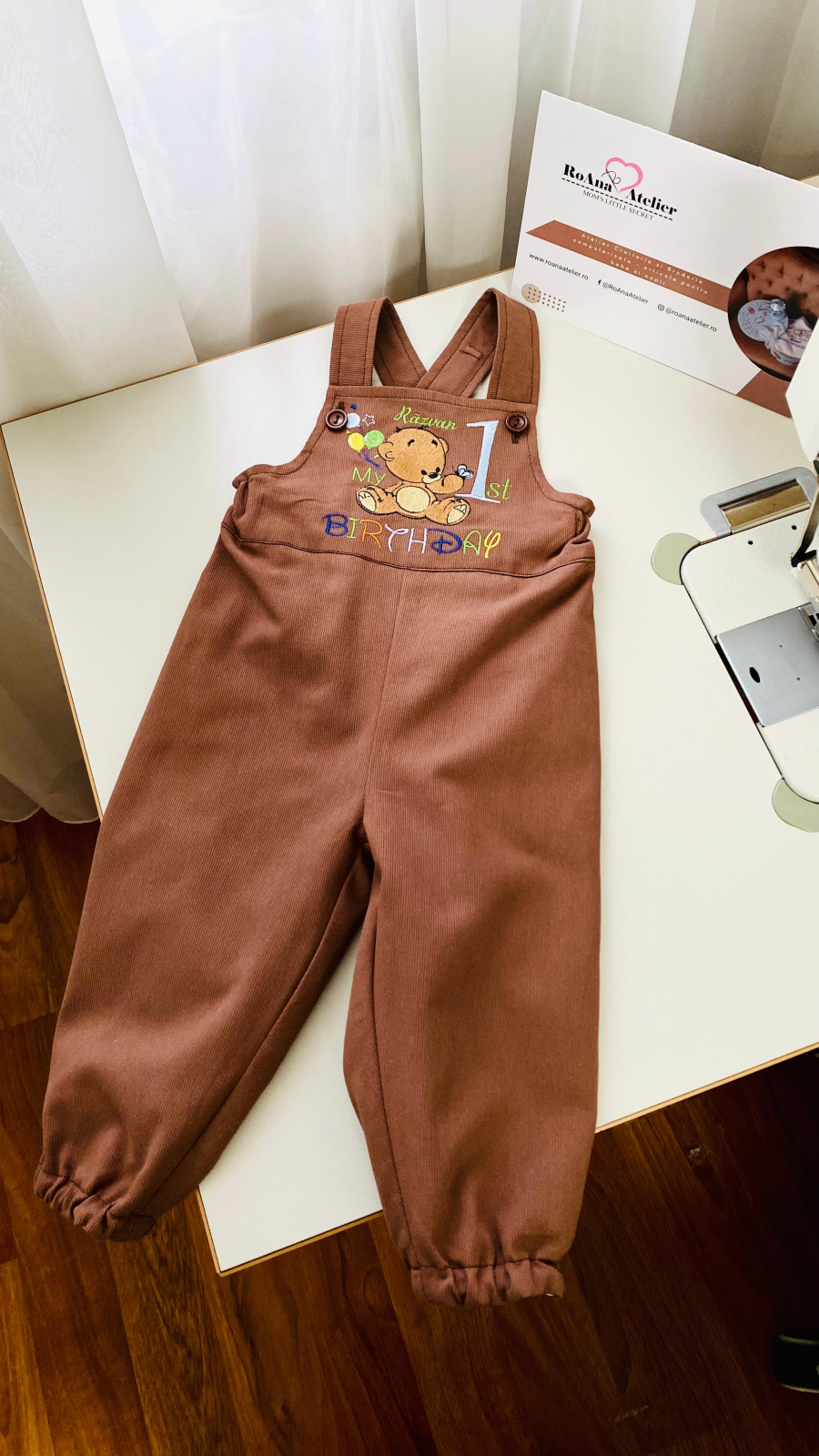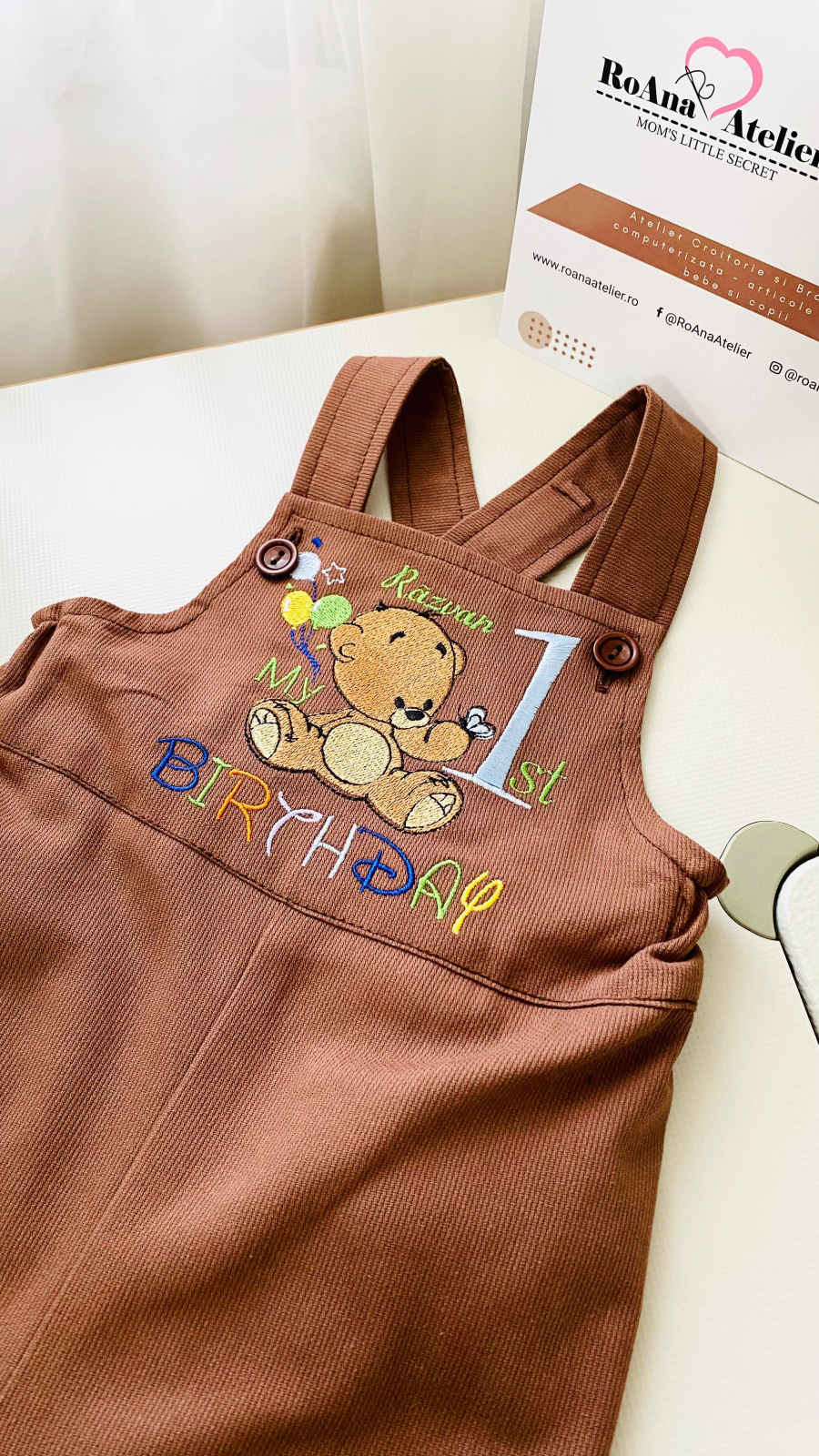 Salopeta Ursulet My First Birthday este confectionata din 100% bumbac, model raiat, intr-o nuanta de maro. Este brodata pe pieptar cu un simpatic ursulet, cu baloane, dar si cu mesajul "My 1st Birthday", ceea ce o face perfecta pentru "Prima Aniversare" a celui mic.