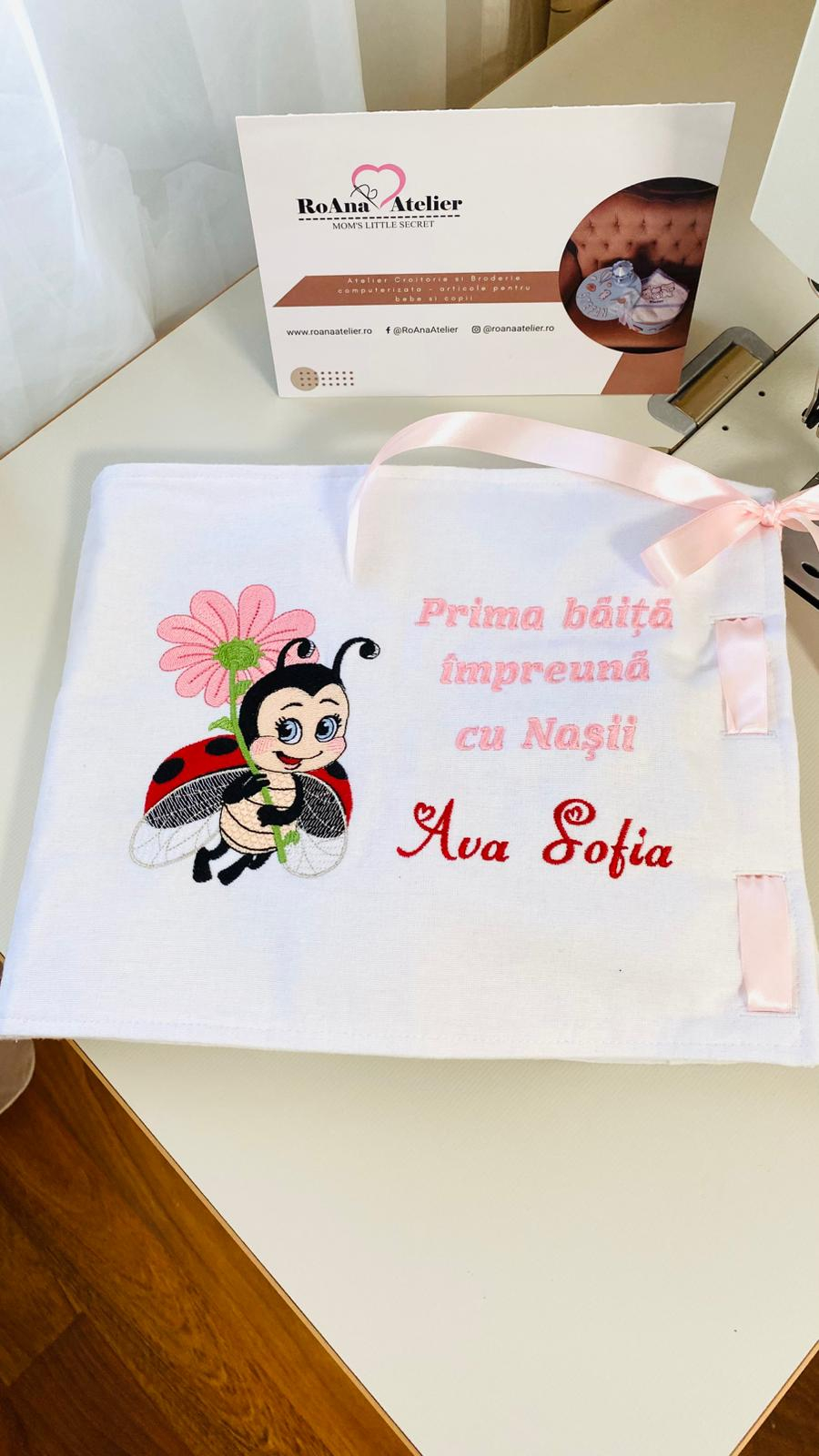 Pe faţa husei este brodata cu o vesela gargarita ce tine o floare, in nuante de rosu si roz si mesajul "Prima baita impreuna cu Nasii" alaturi de numele fetitei, iar pe spate gargarite norocoase. Culoarea predominata este roz si rosu.