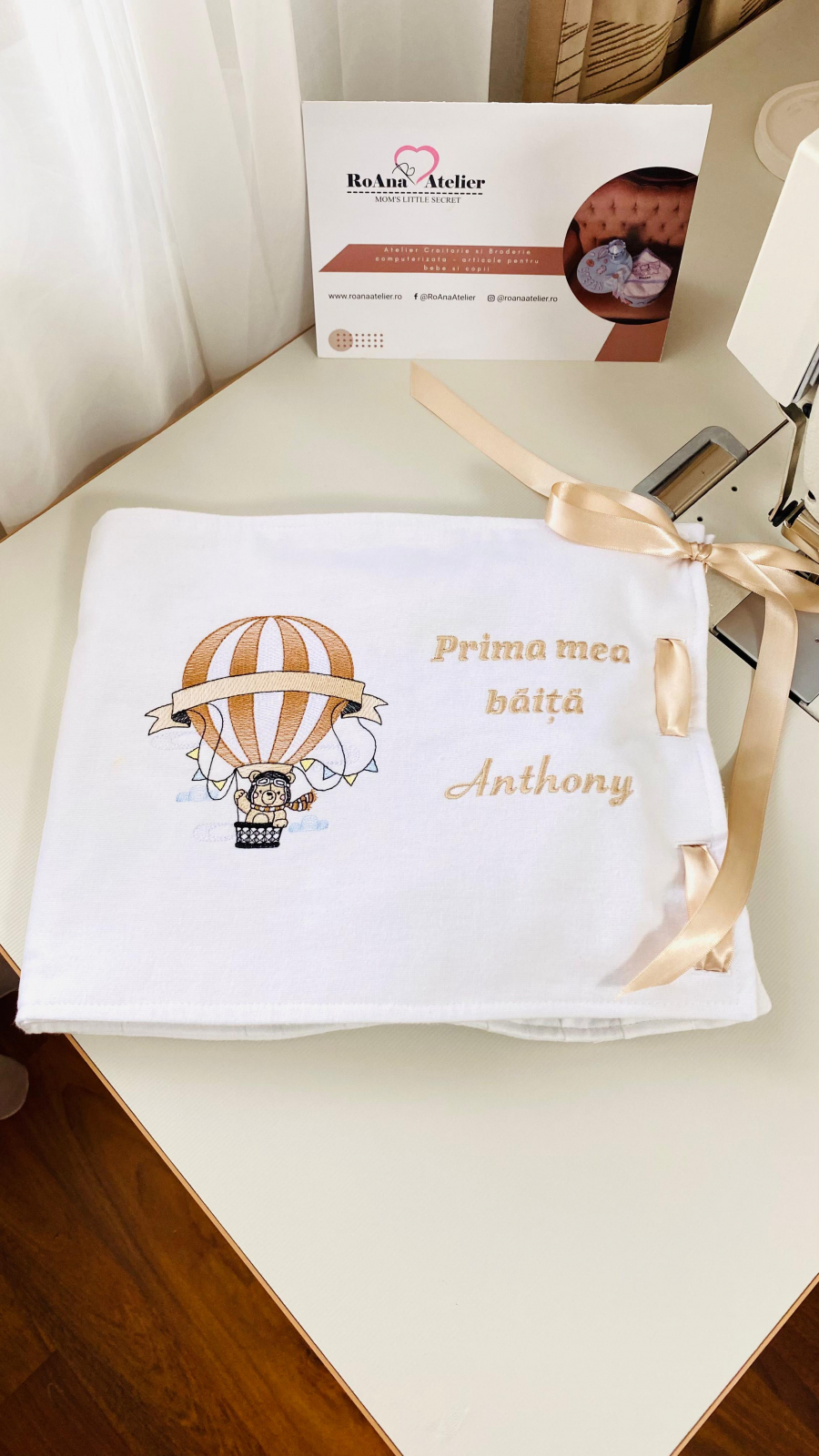Kit Prima mea Baita Ursulet Balon Bej personalizat cu nume, realizat integral la noi in Atelier, de la proiectarea husei pana la umplerea cu ingrediente / mirodenii a fiecarei sticlute. Asadar, este un model unicat in categoria lui de produse. Este brodat pe faţa husei cu un ursulet simpatic ce zboara intr-un balon cu aer cald si pe spate ratuste jucause. Culoarea predominata este bej / ivoire / bronz, potrivit pentru baietei, insa se poate si in nuante de roz pentru fetite.