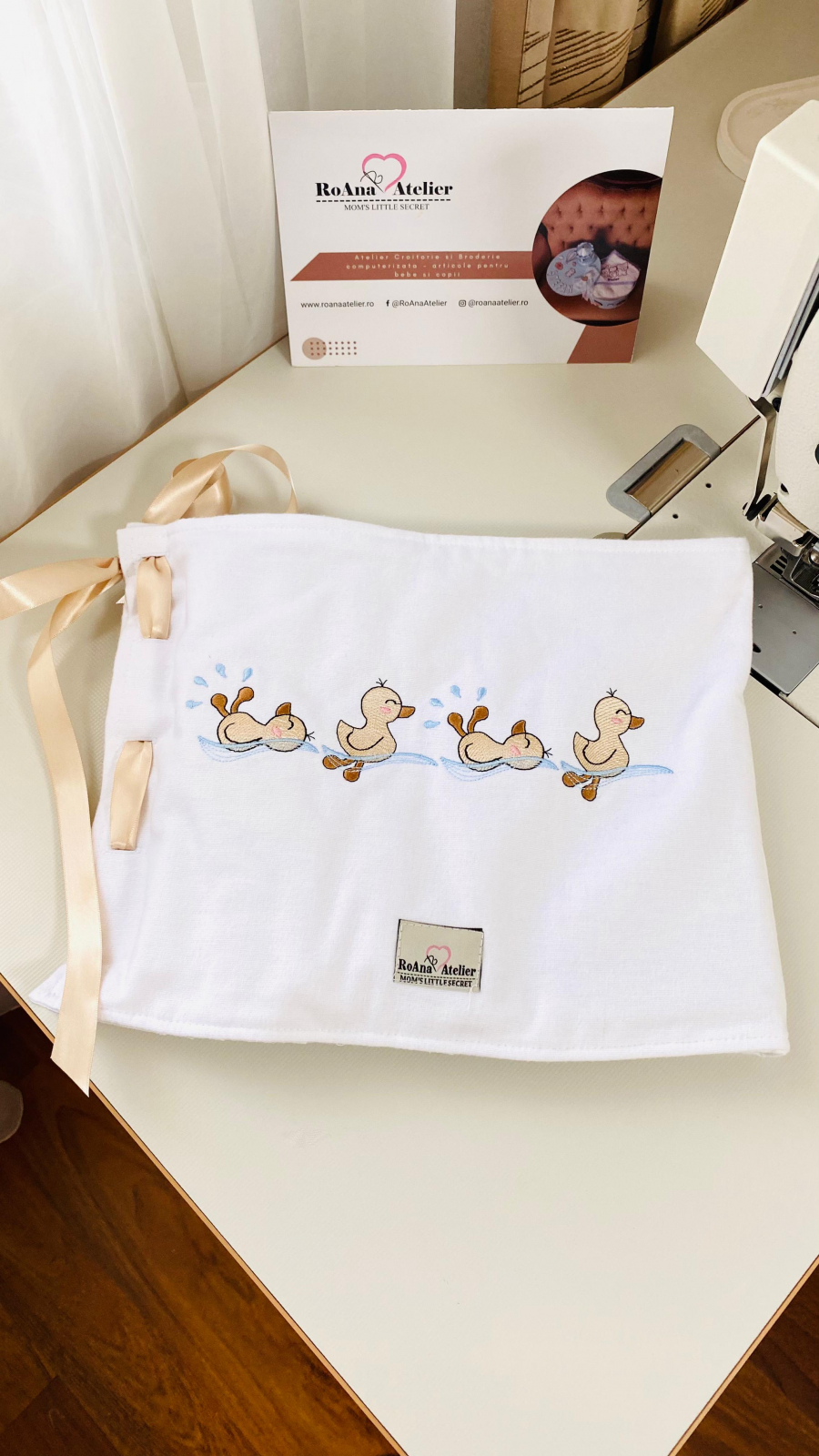 Husa este personalizata cu numele bebelusului, ce se poate broda in orice nuanta se doreste - de mentionat la plasarea comenzii numele copilului si nuanta dorita.