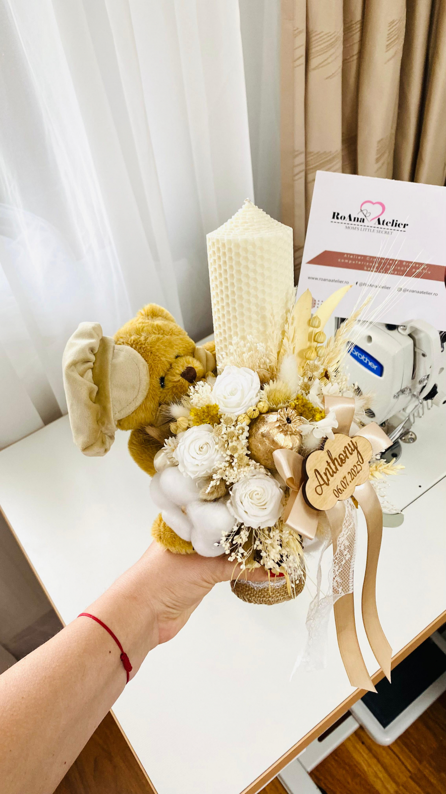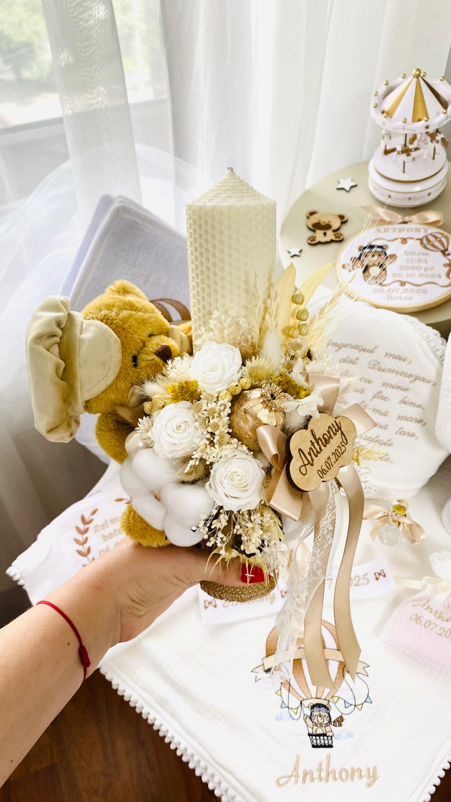 Lumanarea este personalizata prin adaugarea unui norisor din lemn gravat cu numele copilului si data botezului. De asemenea este prevazuta si cu o jucarie, un ursuleț de pluș cu sapca / bascuta si papion bej, pentru a pastra tematica evenimentului.