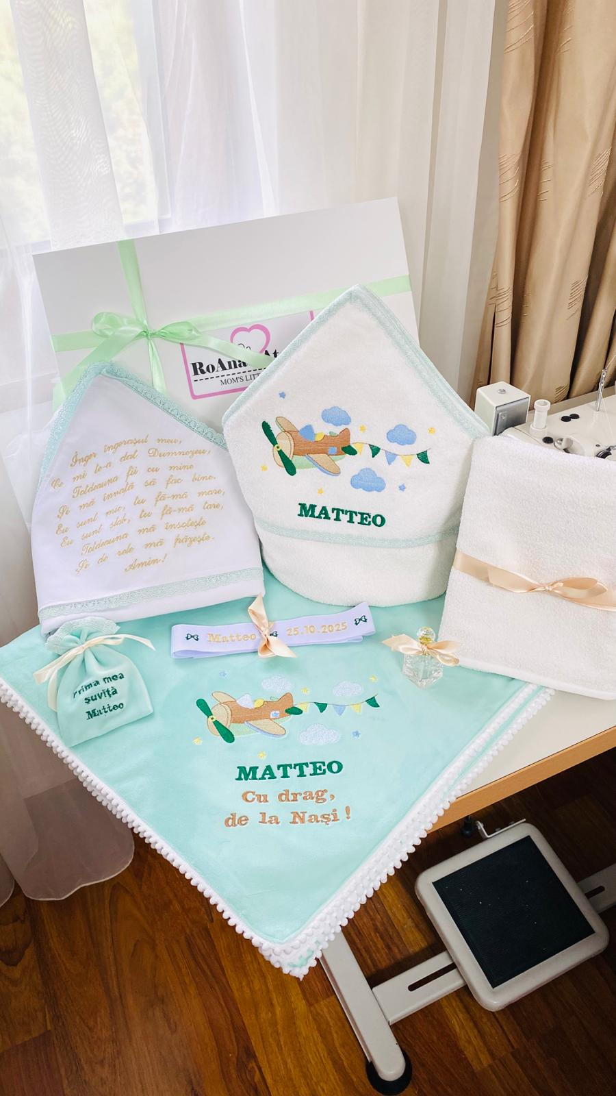 Trusoul de botez se poate completa cu Lumanarea asortata de aici si/sau cutie trusou de aici.