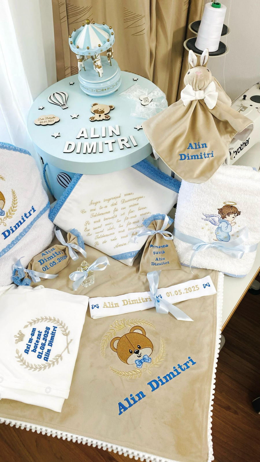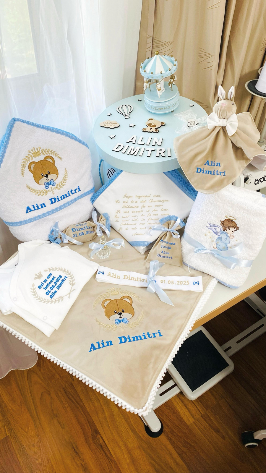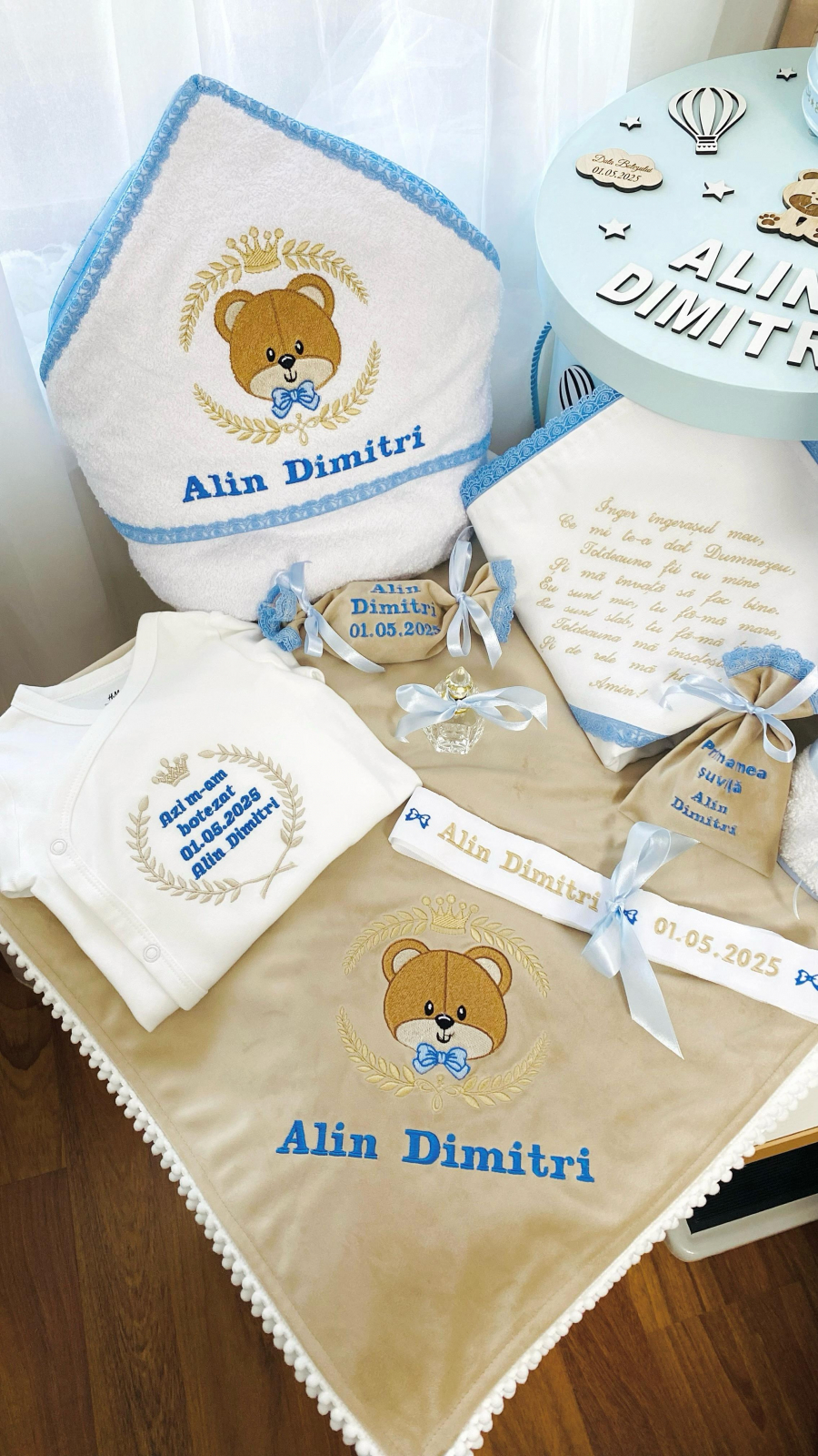 Trusou Botez Baiat Ursulet Bej format din 11 piese, ce include si cutia rotunda pentru trusou. Articolele sunt lucrate din catifea premium bej, bumbac 100% si dantela bleu - albastra, personalizate prin brodare cu numele bebelusului si data botezului.