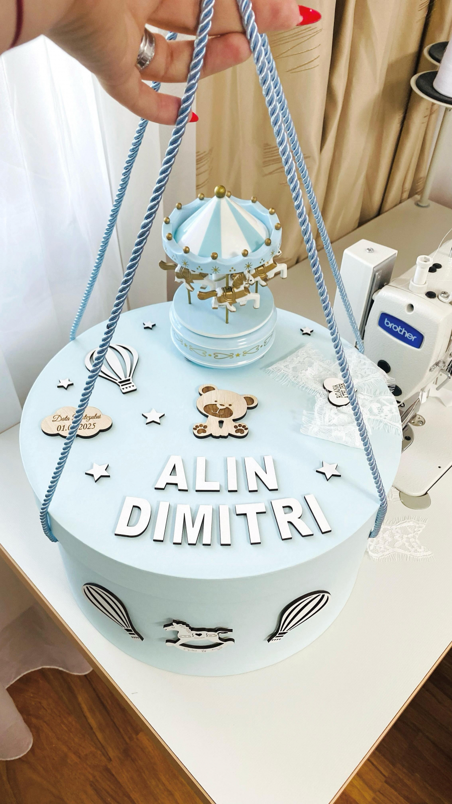 - cutie rotunda bleu decorata manual cu elemente din lemn in forma de norisori, stelute, balon cu aer cald, calut balansoar, fundita si snururi albastre din matase. Numele copilului este realizat din litere individuale din lemn alb si aplicat pe cutie. Pe mijlocul cutiei de trusou este aplicat un ursulet din lemn si o cutie muzicala tip carusel, functionala, avand o melodie linistitoare pentru bebe. Cu siguranta va fi o amintire draga pentru parintii micutului increstinat.