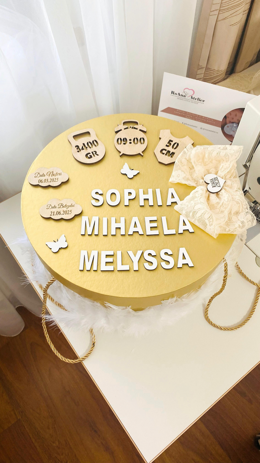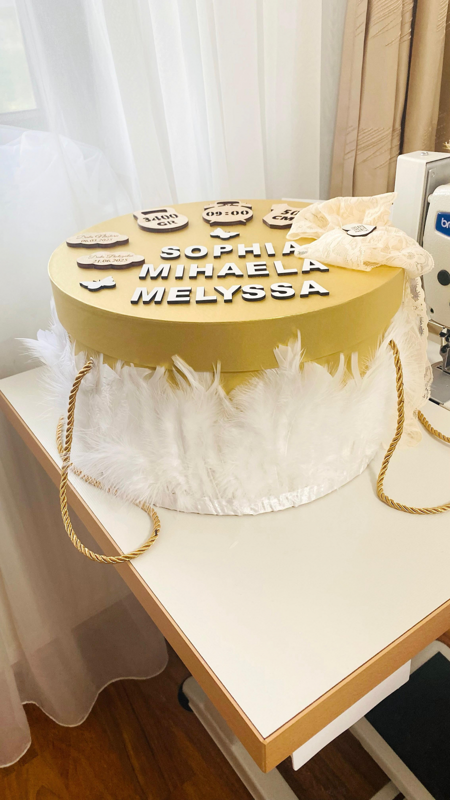 - cutie rotunda aurie tip cufar cu snururi din matase, decorata pe contur cu pene albe de lebada. Capacul cutiei este personalizat cu numele copilului din litere albe individuale si elemente din lemn reprezentantive cu datele nasterii (ora nasterii, greutatea si lungimea), norisori gravati cu data Botezului si data Nasterii. Cu siguranta va fi o amintire draga pentru parintii micutului increstinat.