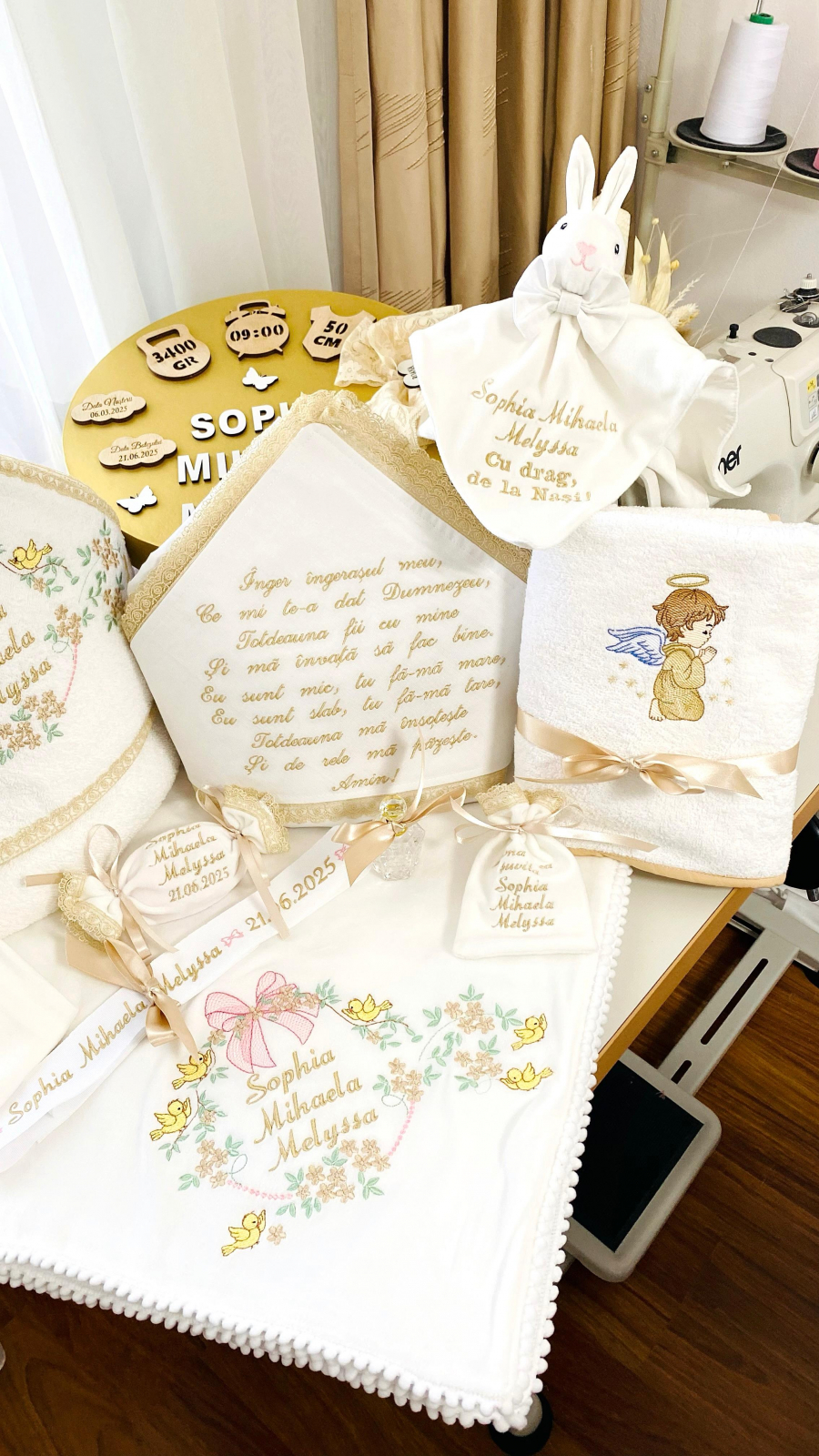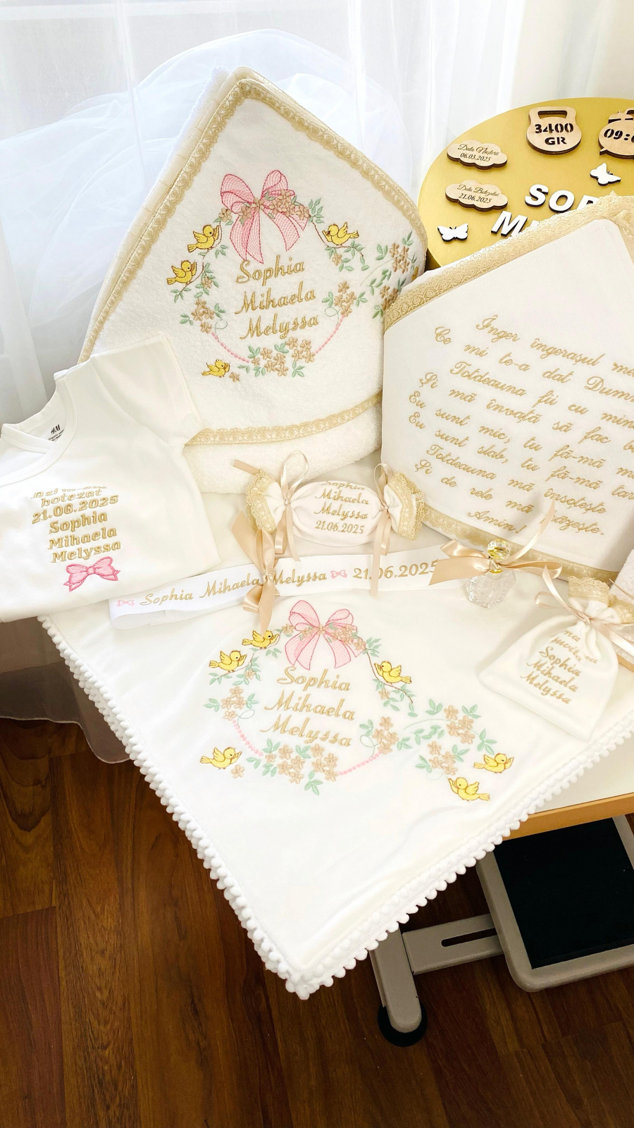 Trusou Botez Melyssa alb cu auriu realizat din catifea premium alba, bumbac si dantela fina aurie. S-a ales ca tematica pentru trusou un design delicat, gingaș și plin de tandrețe. Numele bebelinei într-un cadru de poveste: crenguțe cu frunzulițe jucăușe, floricele gingașe și păsărele ce par să-i cânte numele. Trusoul de Botez este format din 11 piese, astfel: