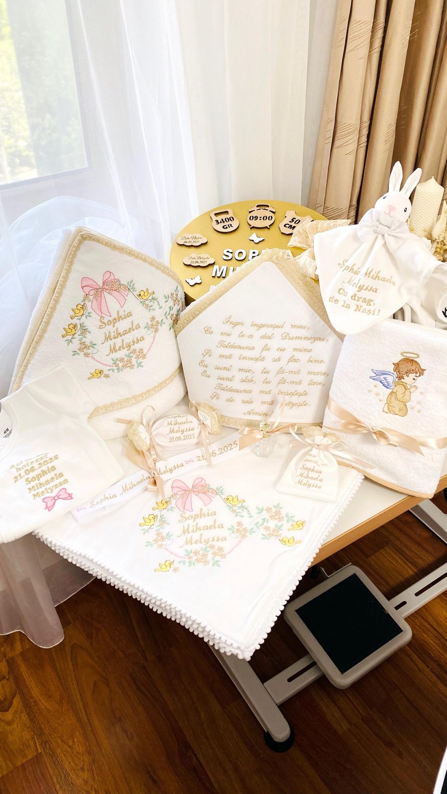 - paturica fina si eleganta din catifea alba, cu bumbac pe interior si ciucurasi moi si albi pe margine, cu o dimensiune de 100 x 100 cm, brodata cu aceasi tematica. Numele micuței brodat în interiorul intr-un frame ce este completat de o fundiță elegantă în partea de sus – un detaliu ce adaugă un strop de rafinament; (*)