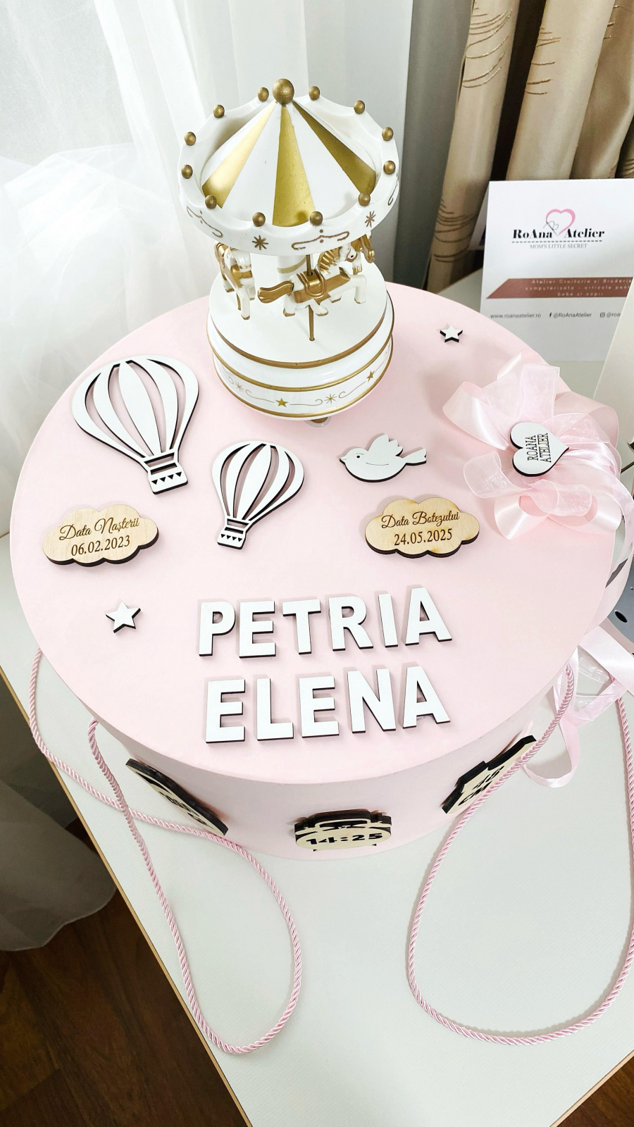 - cutie rotunda roz, cu sidef delicat, decorata manual cu elemente de lemn in forma de norisori, stelute, inimioare, balon cu aer cald, calut balansoar, norisor gravat cu data botezului, fundita si snururi roz din matase. Numele copilului este realizat din lemn si aplicat pe cutie. Pe capacul cutiei este atasat si o cutie muzicala tip carusel, functionala, avand o melodie linistitoare pentru bebe.