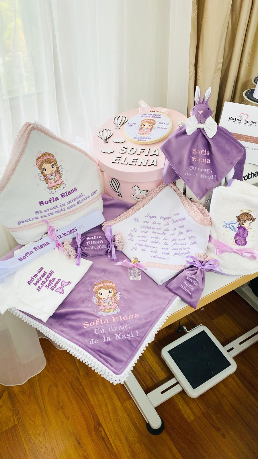 Trusou Botez Mov Fetita Ingeras cu porumbel realizat din catifea premium mov, bumbac si dantela roz, cu broderie in nuante de lila si mov, format din 11 piese, astfel: