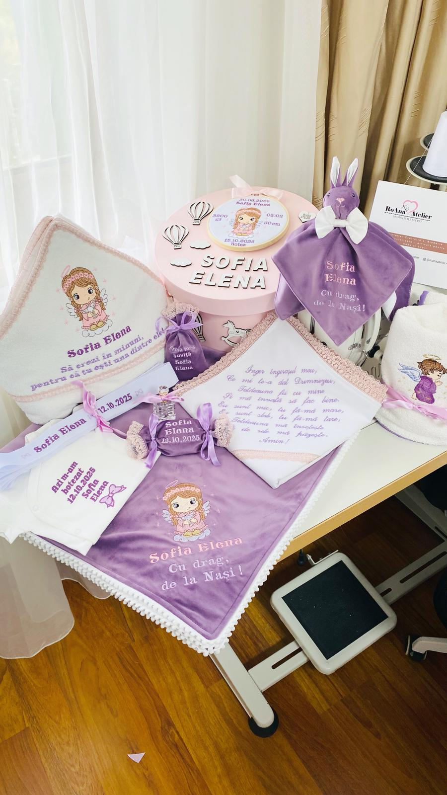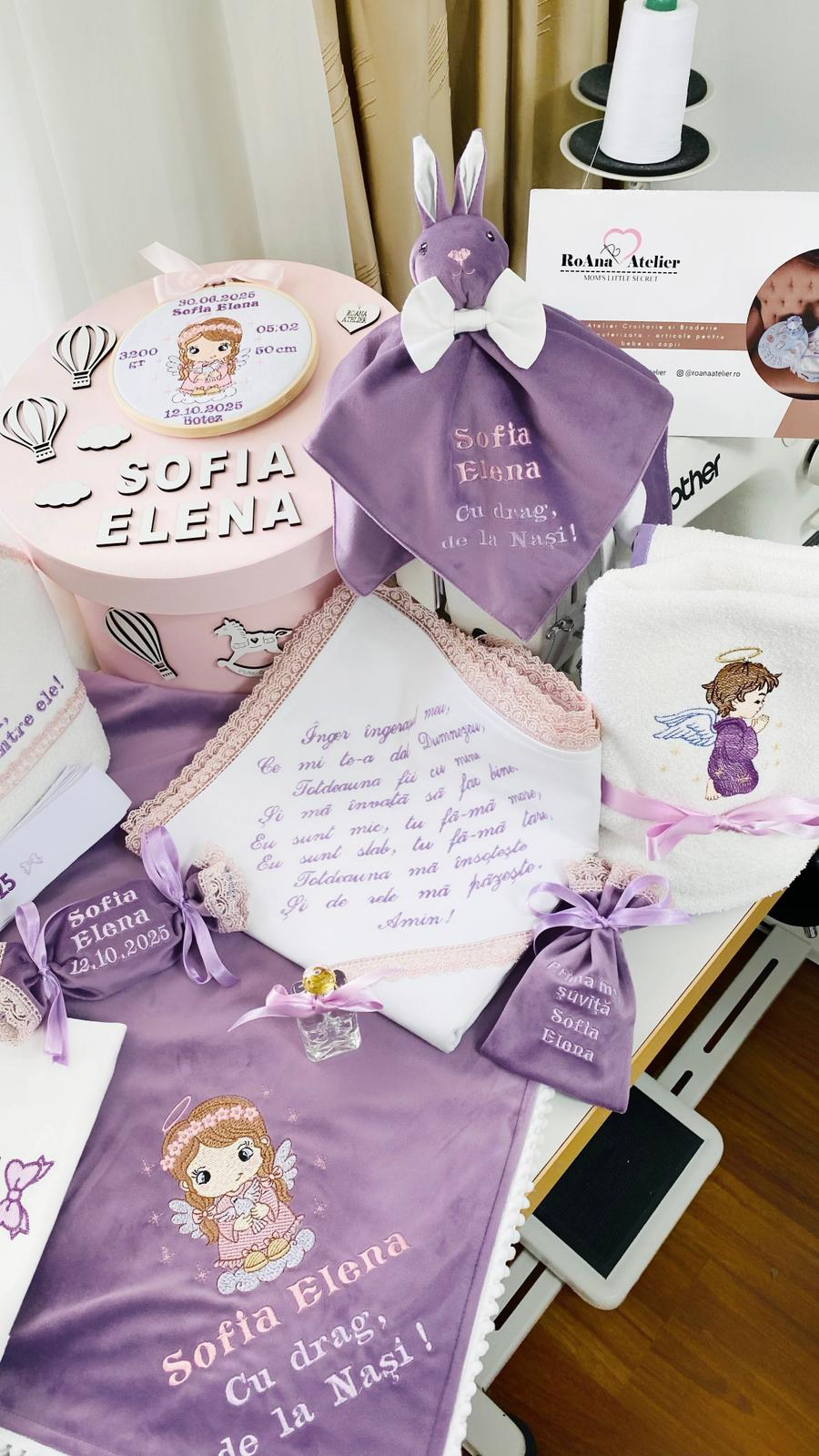 - paturica fina si eleganta din catifea mov, cu bumbac pe interior si ciucurasi moi si albi pe margine, cu o dimensiune de 100 x 100 cm, brodata cu aceasi tematica si cu mesajul "Cu drag, de la Nasi!". Paturica este personalizata cu numele fetitei; (*)