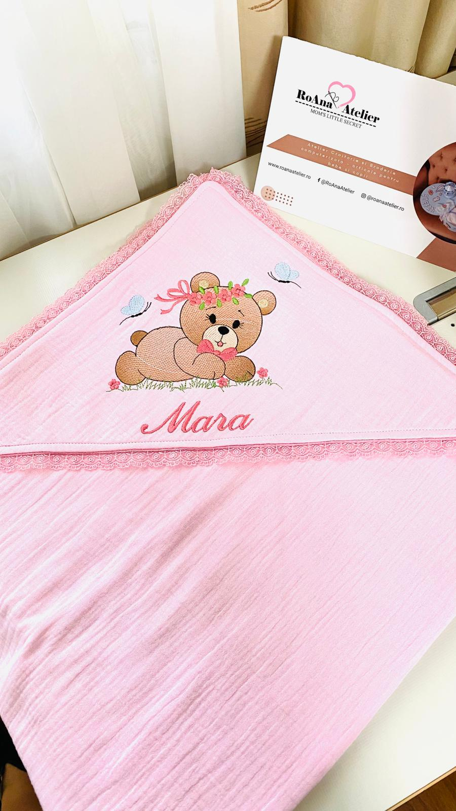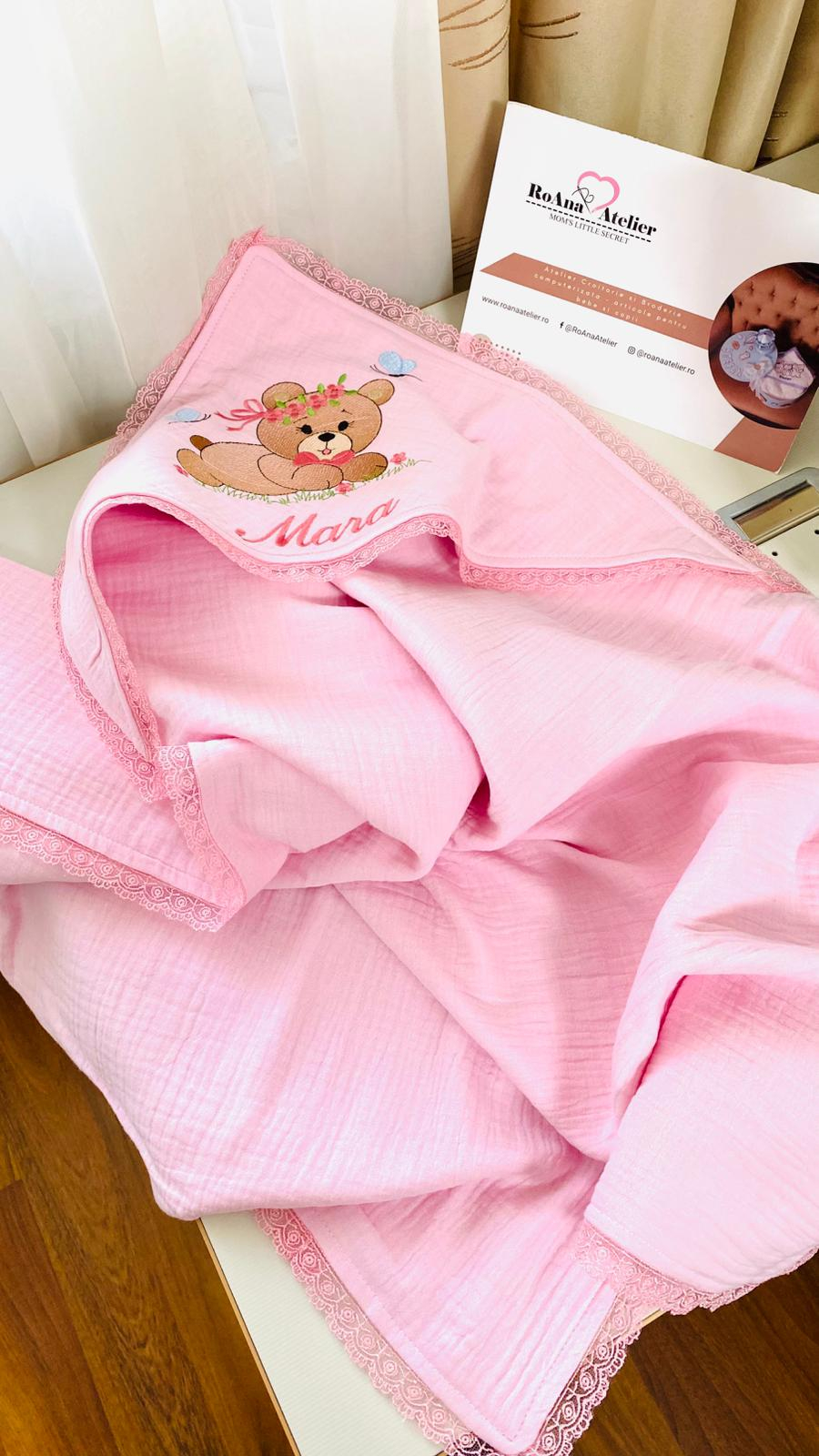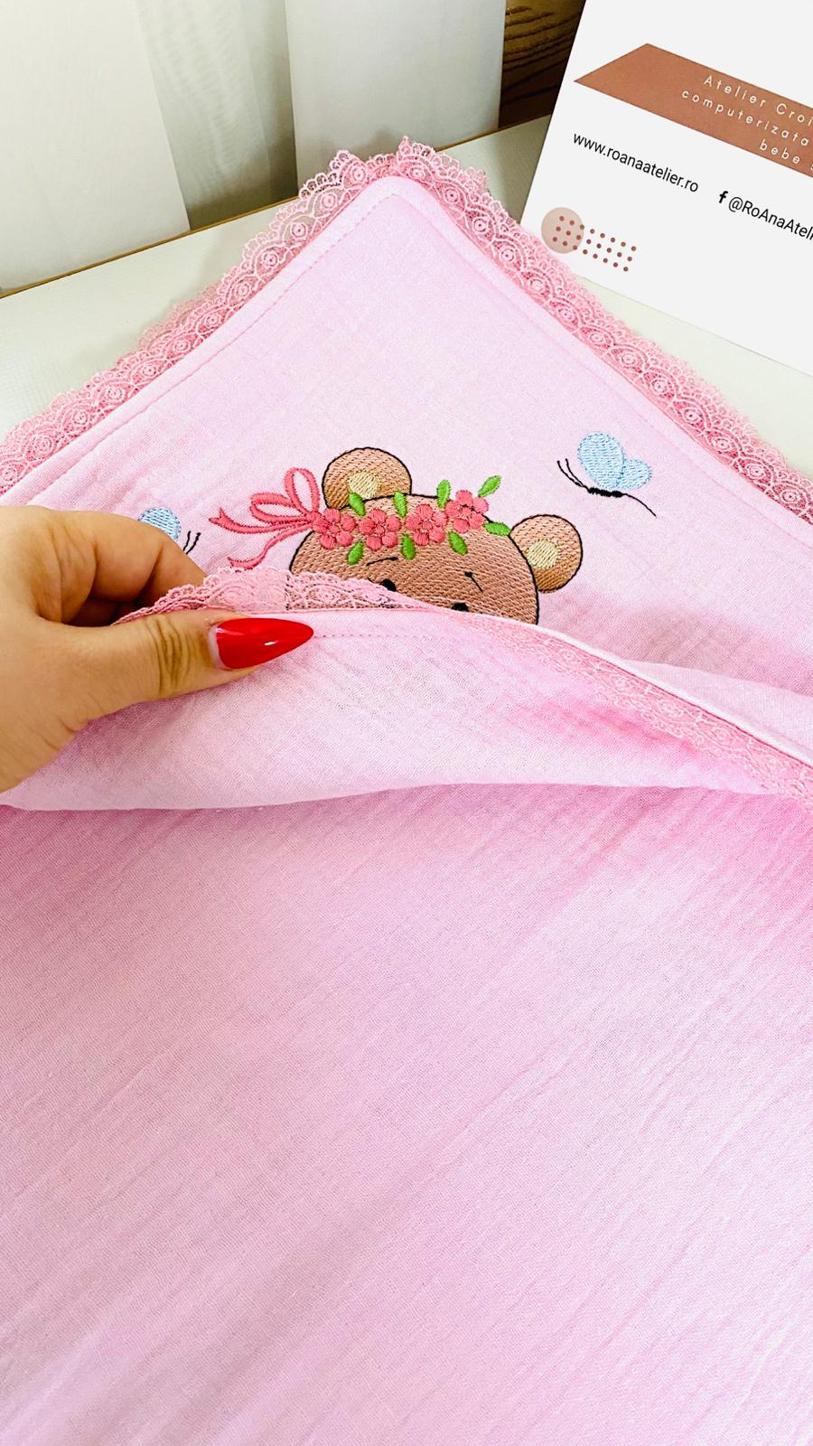 Pled cu capison muselina roz Ursulica lucrat la noi in Atelier si brodat cu un ursulet cu fundita si coronita din flori, ideal pentru a păstra bebelușul la temperatura optimă, indiferent de sezon.