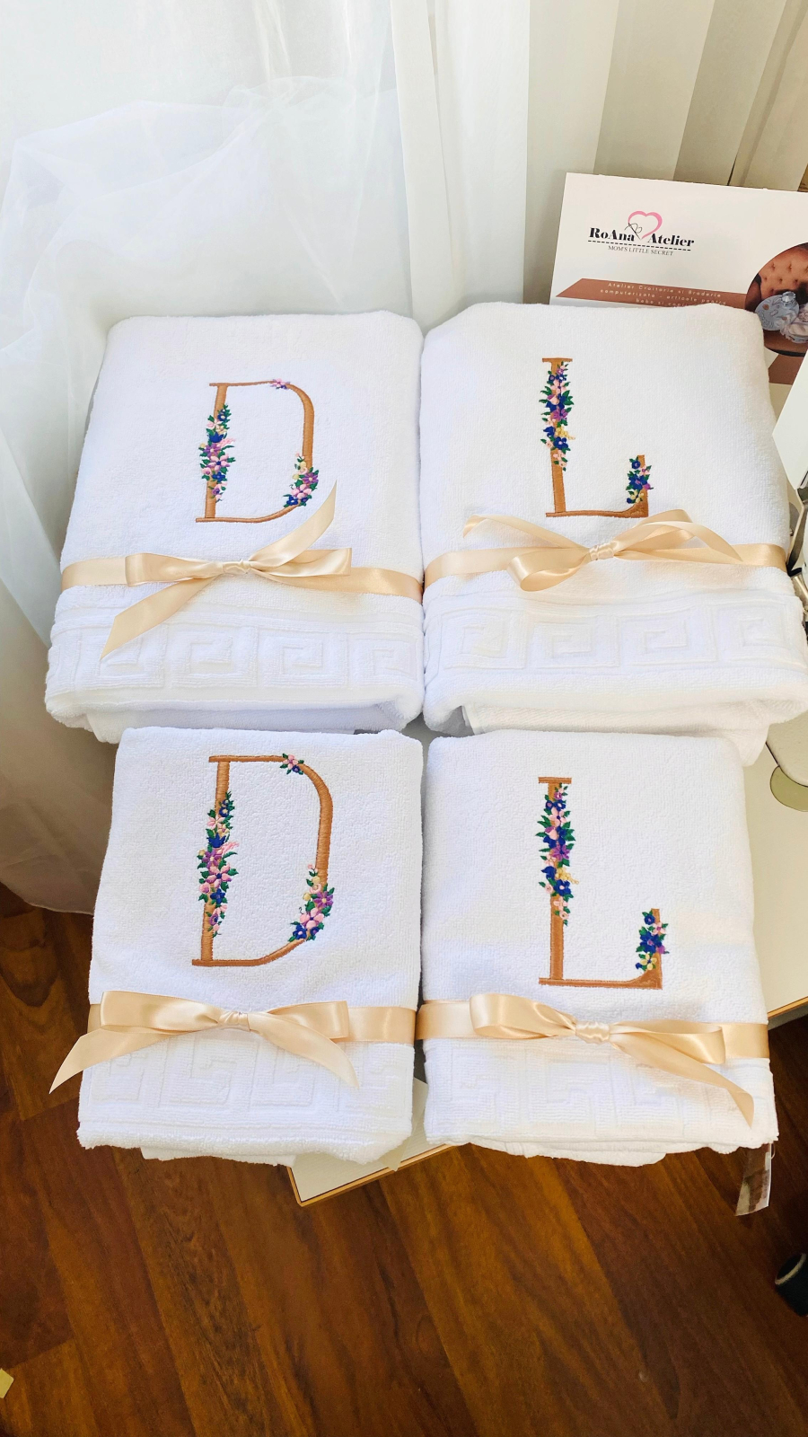 Set prosoape mari, albe, de calitate hoteliera, moi si pufoase, cu putere mare de absorbție, din bumbac 100%, gros, personalizate prin brodare cu initialele dorite. Litera este decorata cu mici floricele colorate.