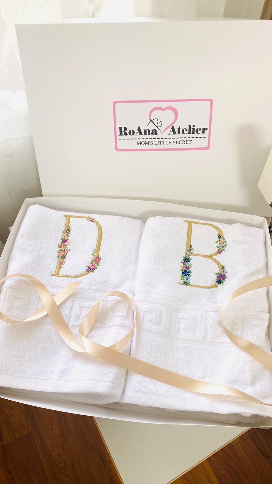 Set prosoape medii albe, de calitate hoteliera, moi si pufoase, cu putere mare de absorbție, din bumbac 100%, gros, cu o densitate de 500g/mp, personalizate prin brodare cu initialele dorite. Litera este decorata cu mici floricele colorate.
