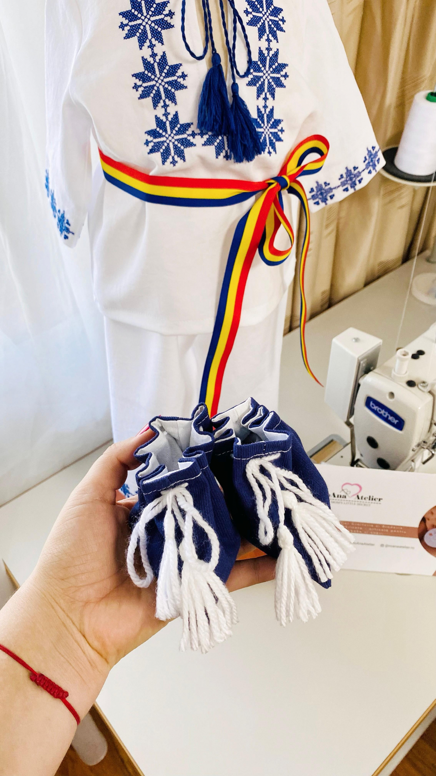 Pantalonii sunt din acelasi material, cu talia prevăzută cu elastic pentru a se potrivi perfect micuțului tău. De asemenea, pantalonii sunt brodați cu aceleași motive tradiționale în partea de jos, tot cu ata albastra, completând armonios întreg costumul.