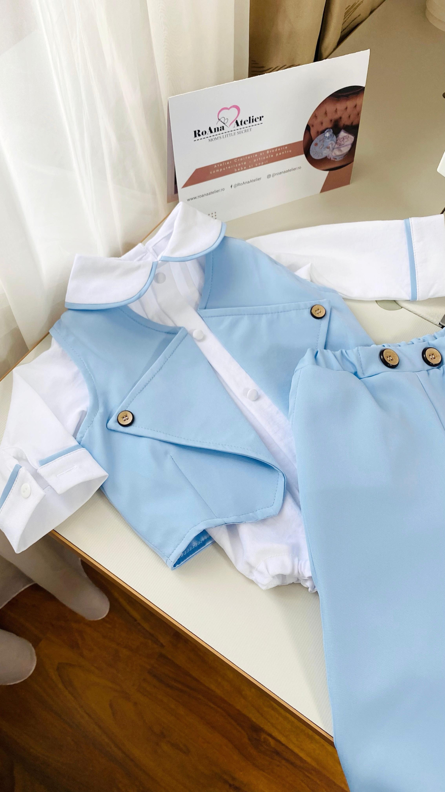 Costumașul de botez Victor cu vesta bleu peste alegerea perfectă pentru o zi cu adevărat specială.