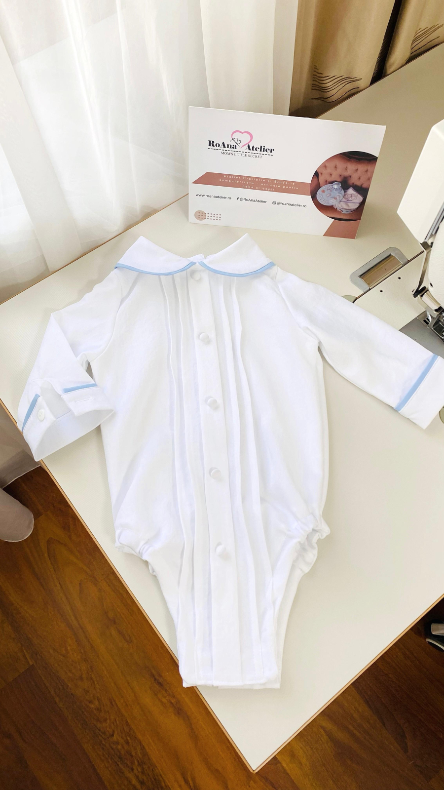 • Cămașă tip body cu detalii vipușcă din țesătură tip inisor alb, cu pliuri fine pe piept și margini bleu, care se închide cu nasturi și capse între piciorușe pentru ușurință la îmbrăcare.
