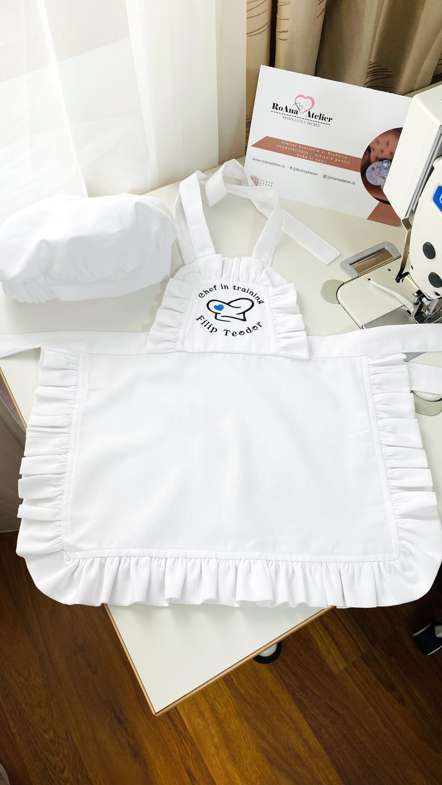 Sort alb si boneta pentru copil personalizate lucrate din bumbac alb, cu volanase pe contur. Pieptarul este brodat si personalizat cu numele copilului si mesajul "Chef in training". Boneta este personalizata cu Chef urmat de numele fetitei si o inimioara roz.