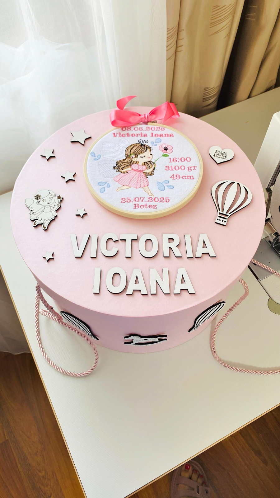 Cutia trusoului este personalizata prin aplicarea pe capac a numelui bebelusului, realizat din litere individuale din lemn alb si un mini tablou brodat cu o zână (fetită zânuță fluturas cu airpioare ținând cu drag o floricică în mânuță), pentru a pastra tematica botezului si cu datele nasterii ale copilului (nume, ziua, ora, lungimea si greutatea) si data botezului, incadrat intr-un gherghef din lemn pentru un efect deosebit.