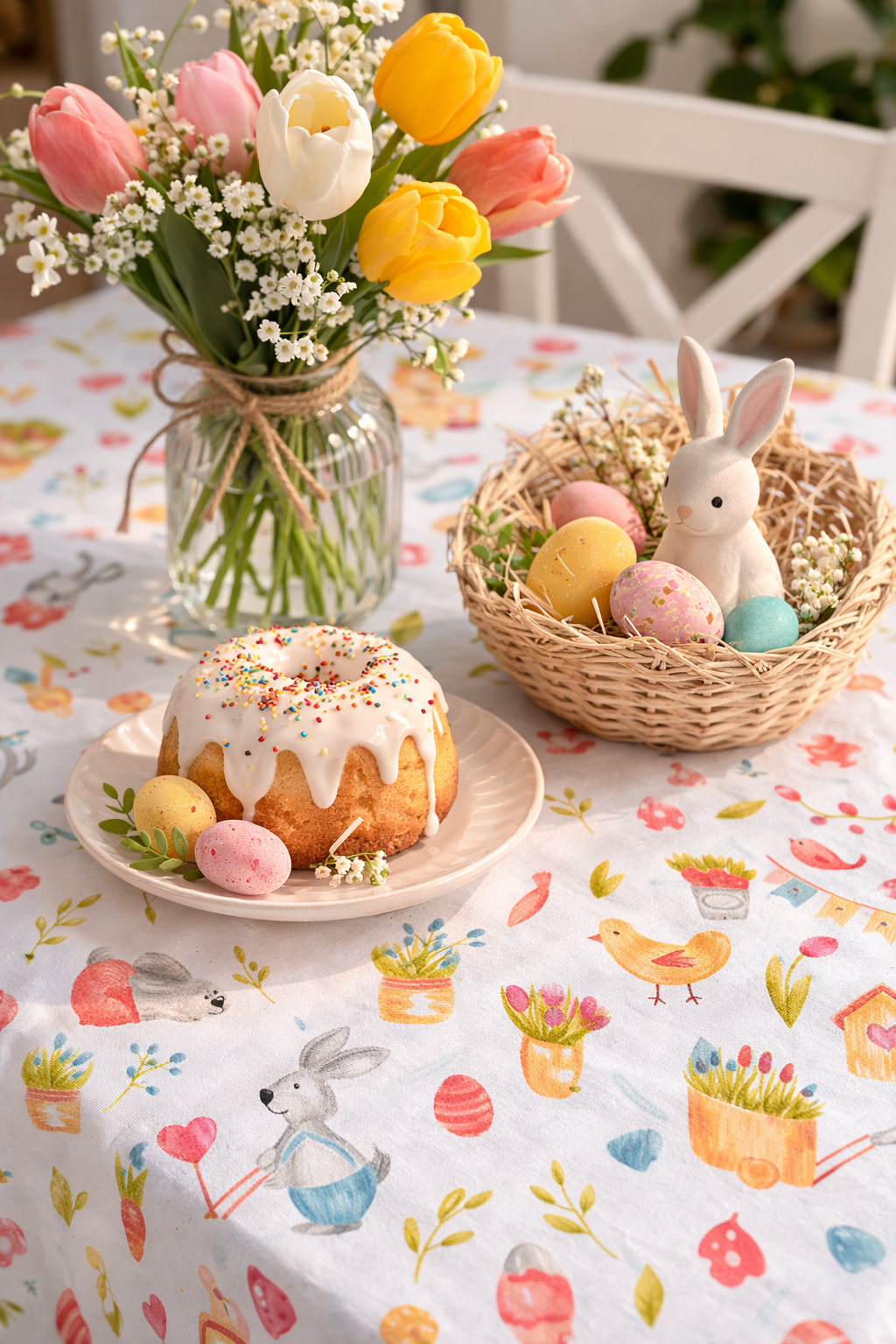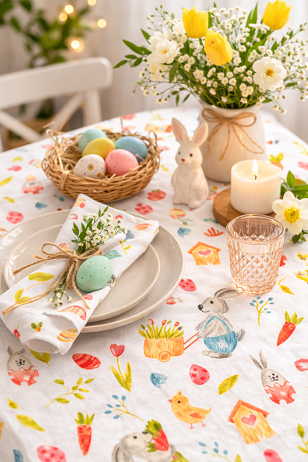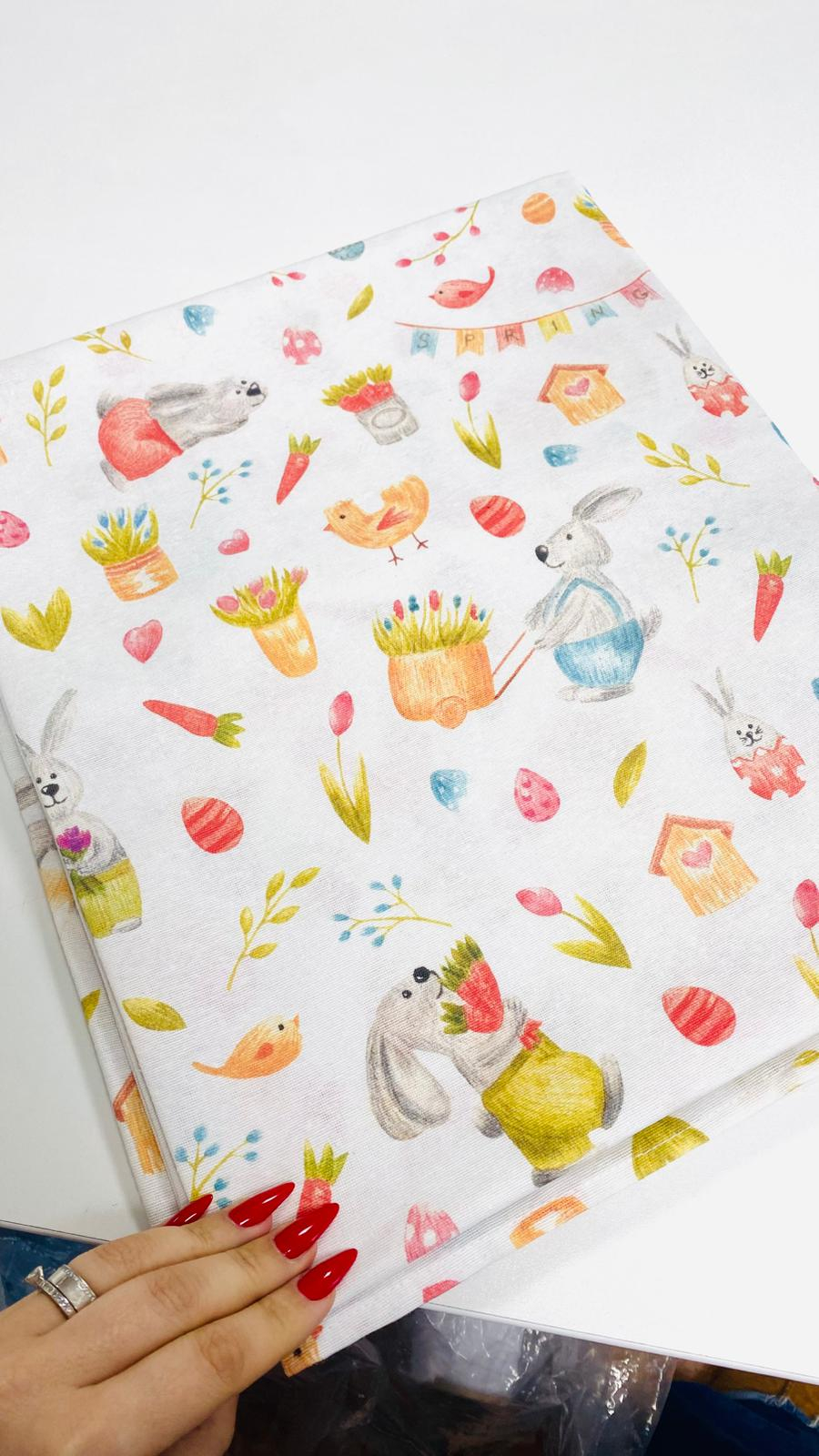 Fata de masa cu Iepurasi de Paste confectionata in Atelierul nostru din bumbac 100% cu print cu iepurasi dragalasi si elemente de primavara, precum lalele, floricele, pasarele.