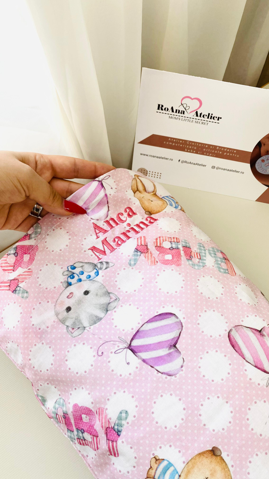 Pernuta gradinita personalizata cu nume cu umplutura usoara din vatelina siliconizata cu proprietati hipoalergenice, certificata Oeko-Tex, cu husa detasabila (fata de perna) din 100% bumbac, certificat Oeko-Tex, cu un imprimeu vesel si jucaus (soricei, pisicute, iepurasi si inimioare), nuanta predominanta a materialului este roz pentru fetite si bleu pentru baietei.