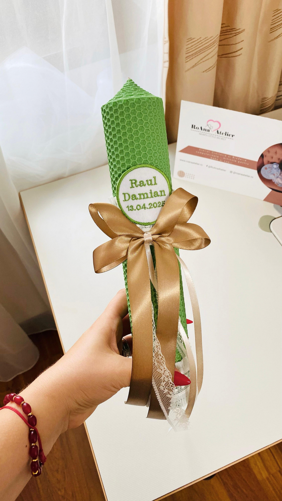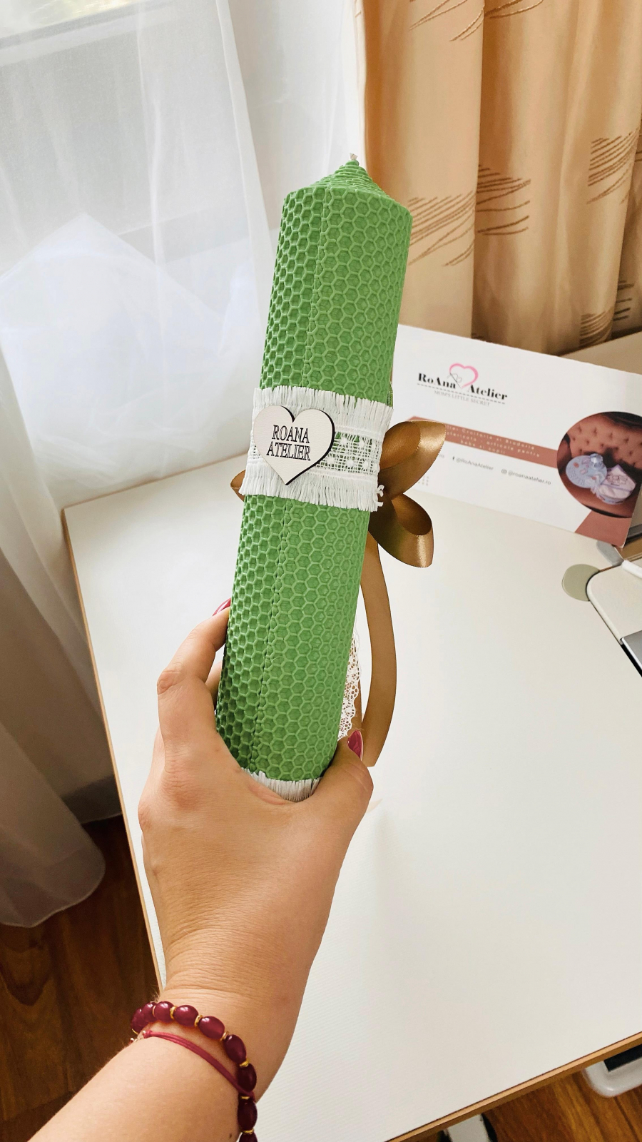 Lumanare Botez Olive tip fagure, intr-o nuanta calda de verde olive, din ceara 100% naturala, cu miros natural din stup, fara parfum adaugat, decorata manual cu dantela si fundita vernil din panglica de satin.