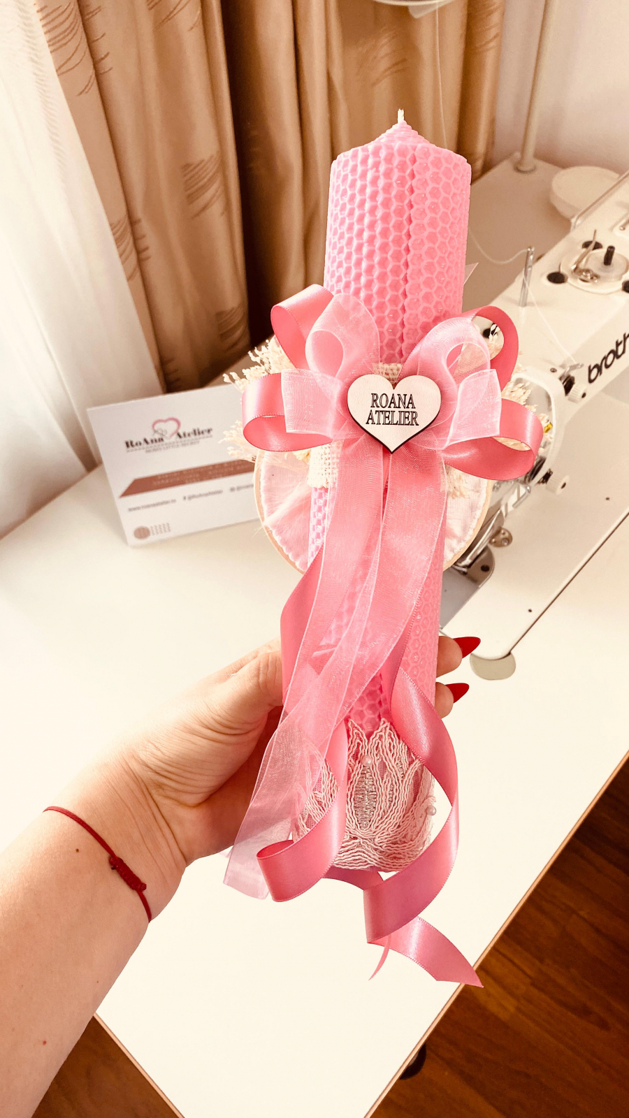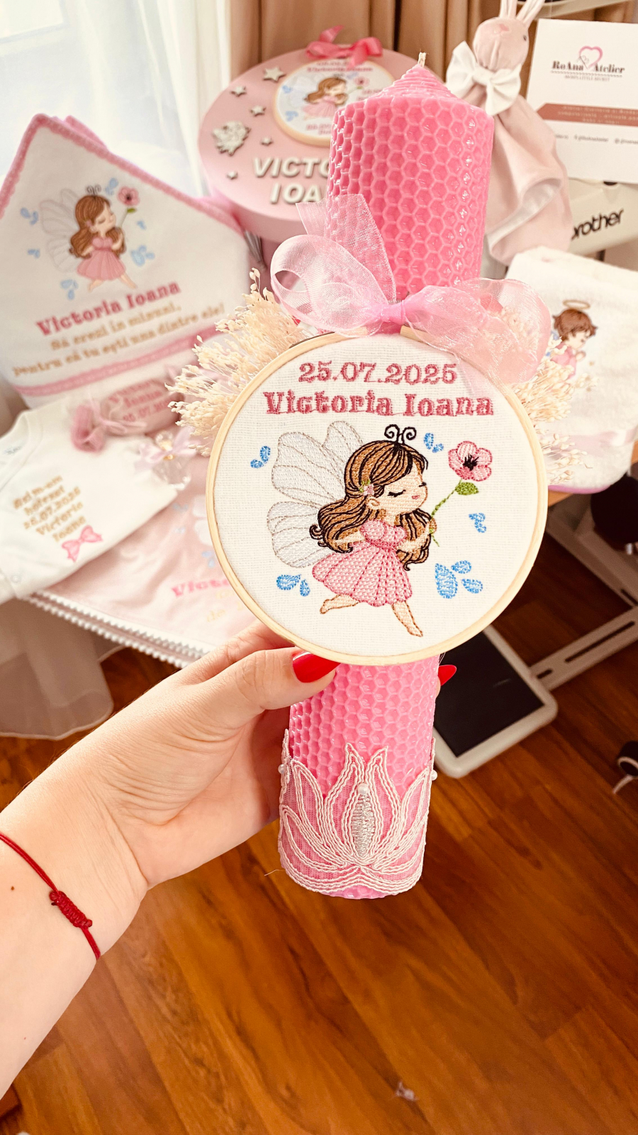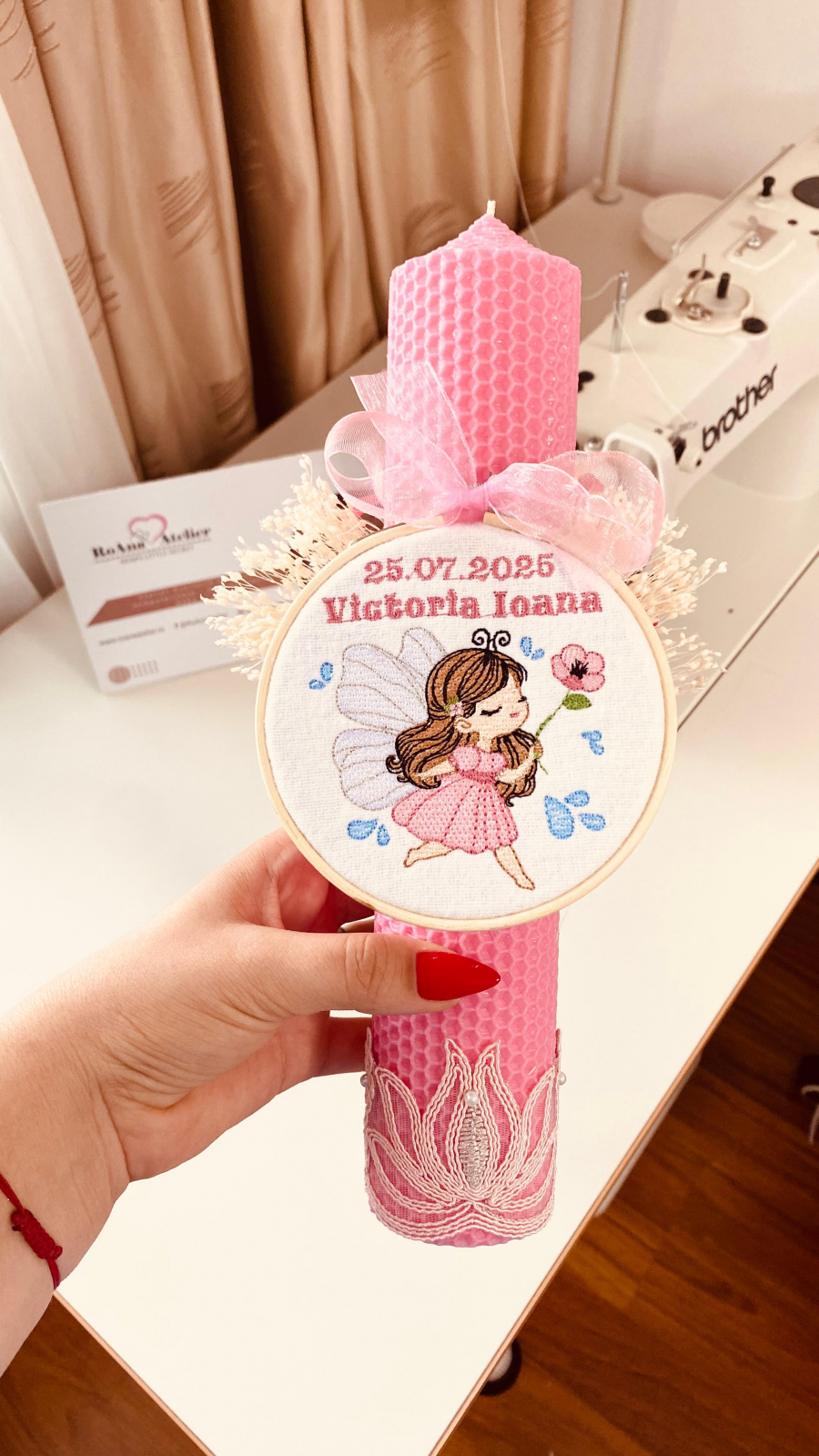 Lumanarea este înfrumusețată cu un gherghef brodat, ce ilustrează o zână (fetită zânuță fluturas cu airpioare ținând cu drag o floricică în mânuță), in nuante de roz si roz trandafiriu. Este personalizată cu numele fetitei și data botezului, pentru a se potrivi perfect tematicii evenimentului și pentru a deveni o amintire prețioasă.
