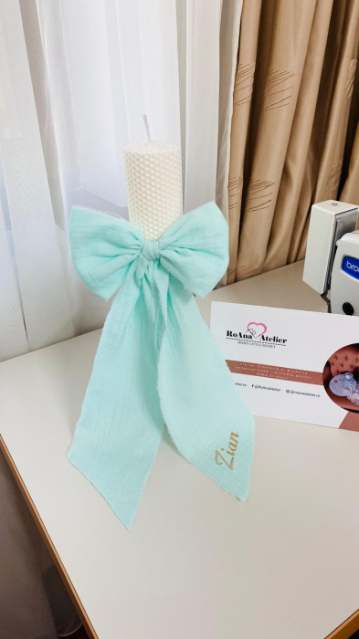 Lumanari Botez din ceara 100% naturala cu fitil din bumbac, realizata manual si decorata cu flori naturale uscate, trandafiri criogenati, flori din bumbac si elemente din lemn gravat cu numele copilului si/sau data nasterii.