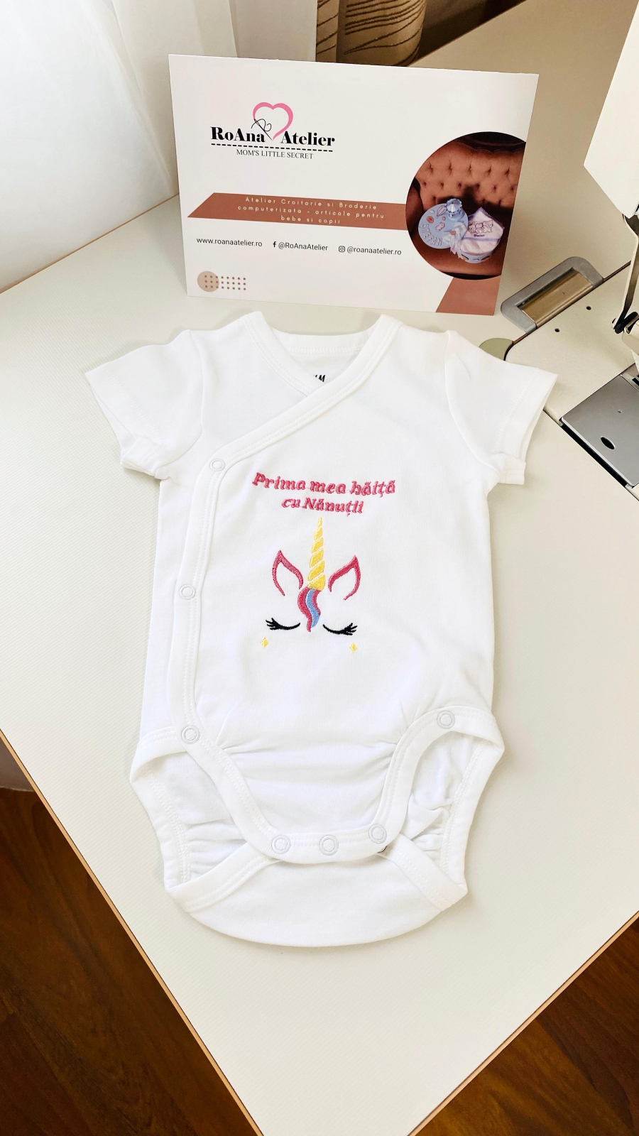 Body Prima Baita Unicorn din 100% bumbac, brodat cu unicorn stilizat si cu mesajul "Prima mea baiţă cu Nănuţii" intr-o nuanta placuta de roz trandafiriu.
