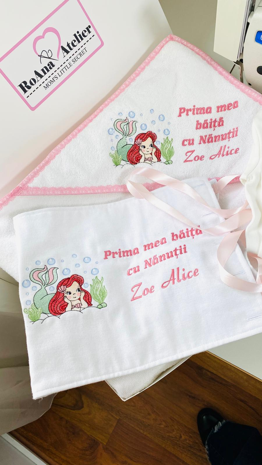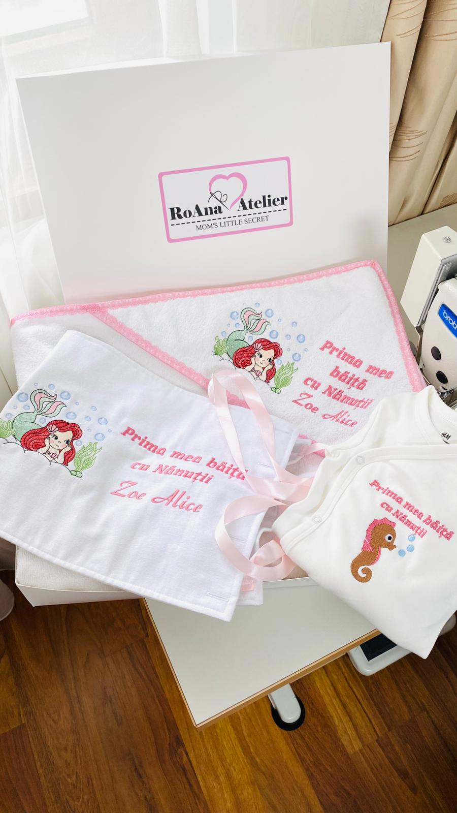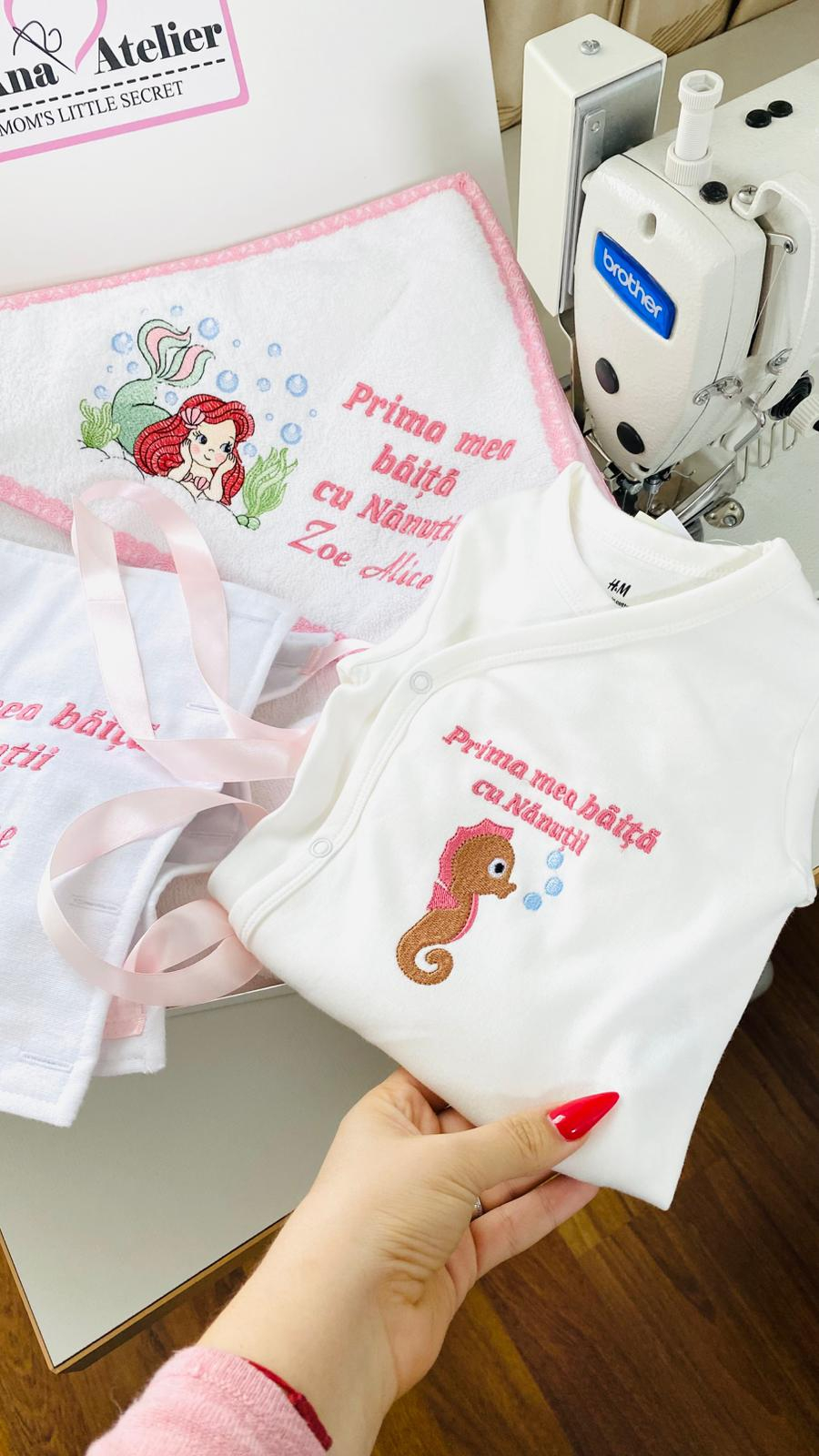 Set Prima Baita cu Nasii Mica Sirena alcatuit din 3 piese brodate si personalizate cu tematica marina - Mica Sirena: