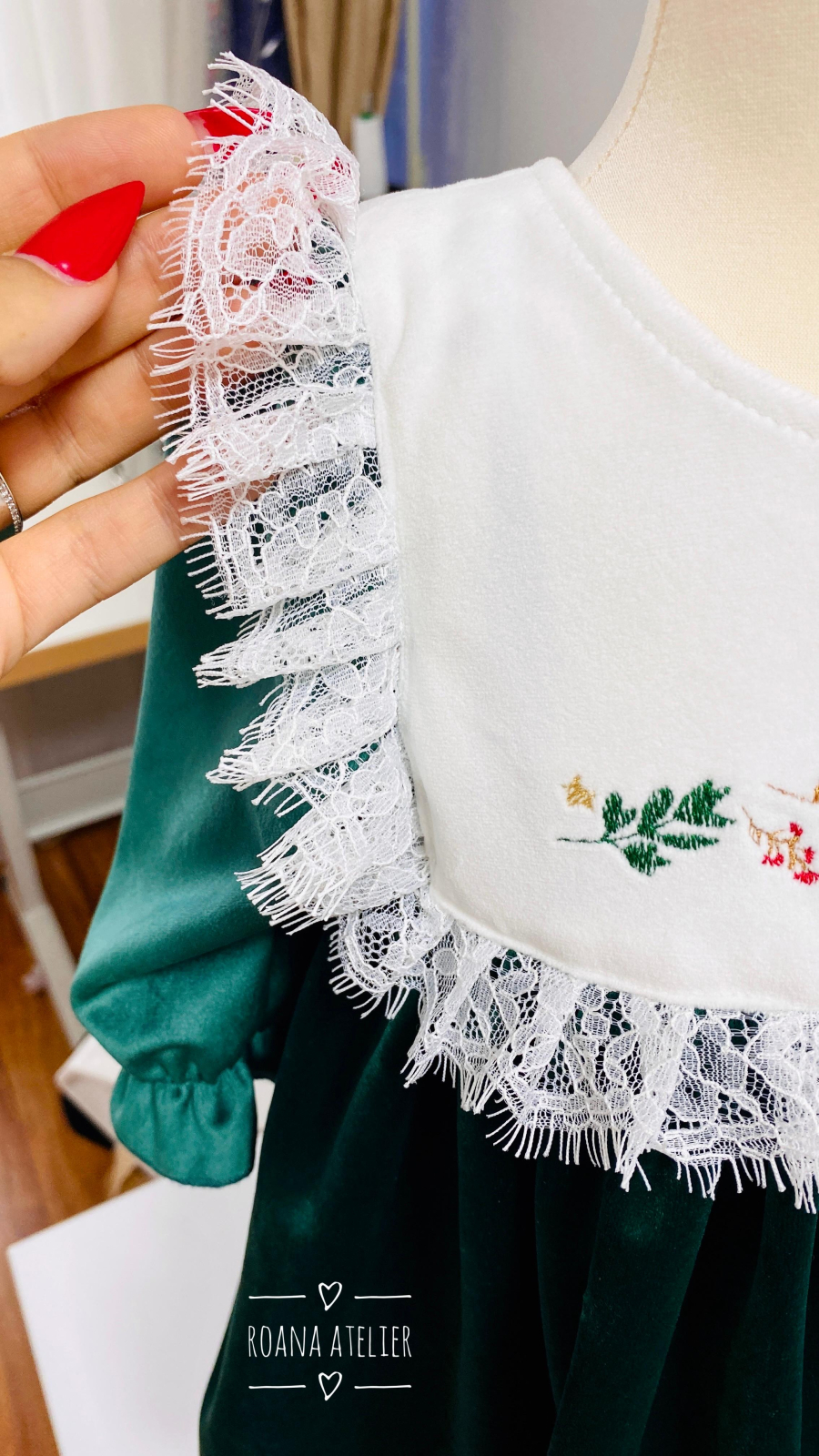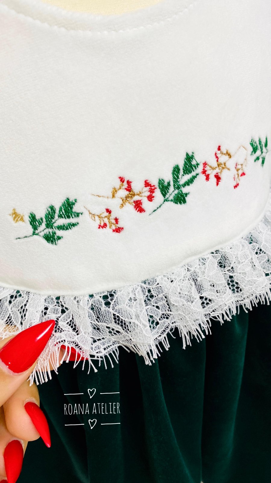 Confecționată din catifea premium verde smarald, moale și luxoasă la atingere, rochița este completată de o parte superioară din catifea albă decorată cu dantelă fină și o broderie delicată cu accente florale.