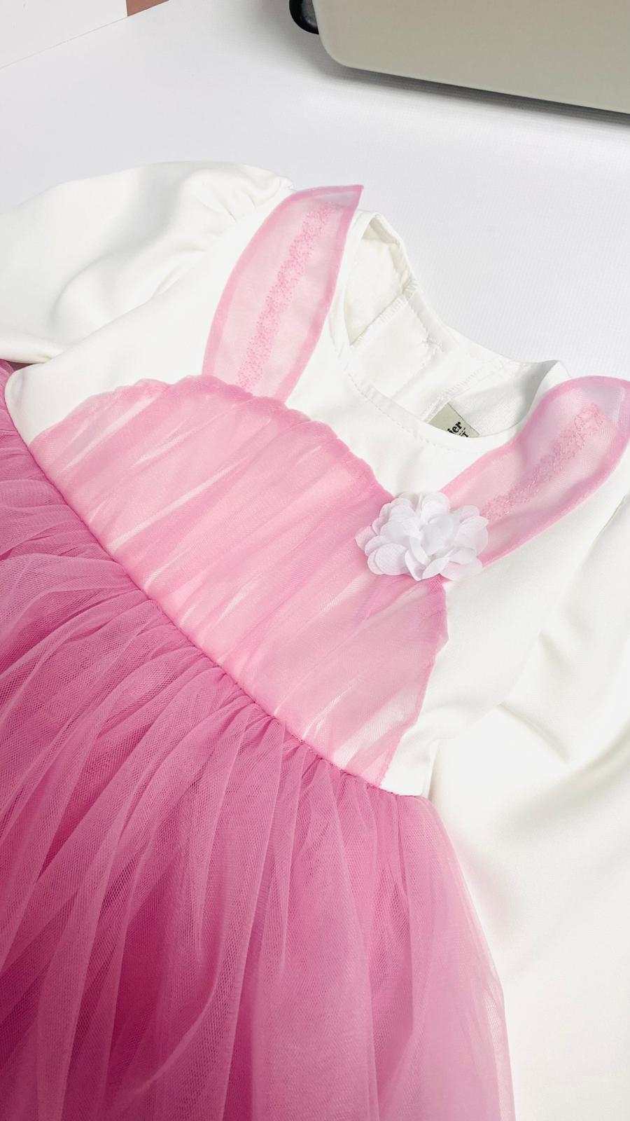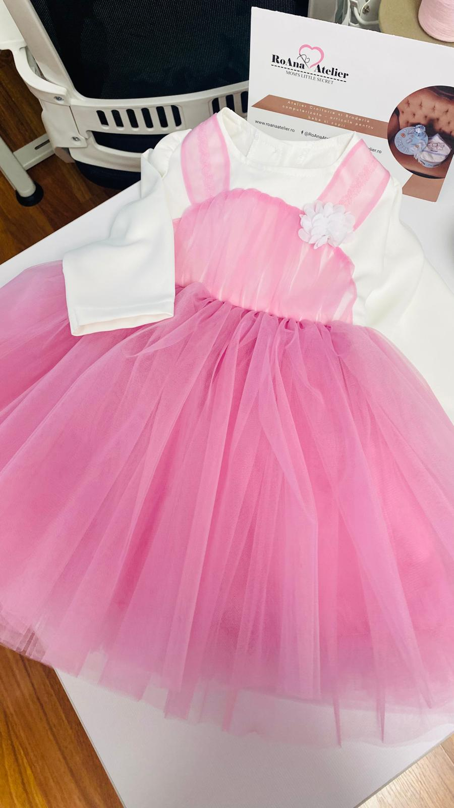 Bustul si manecile sunt confectionate din tricot alb, iar fusta din tulle delicat roz, cu model tip iepuras. Este decorata si cu o mica floricica. Rochita este captusita, extrem de comoda si foarte simpatica.