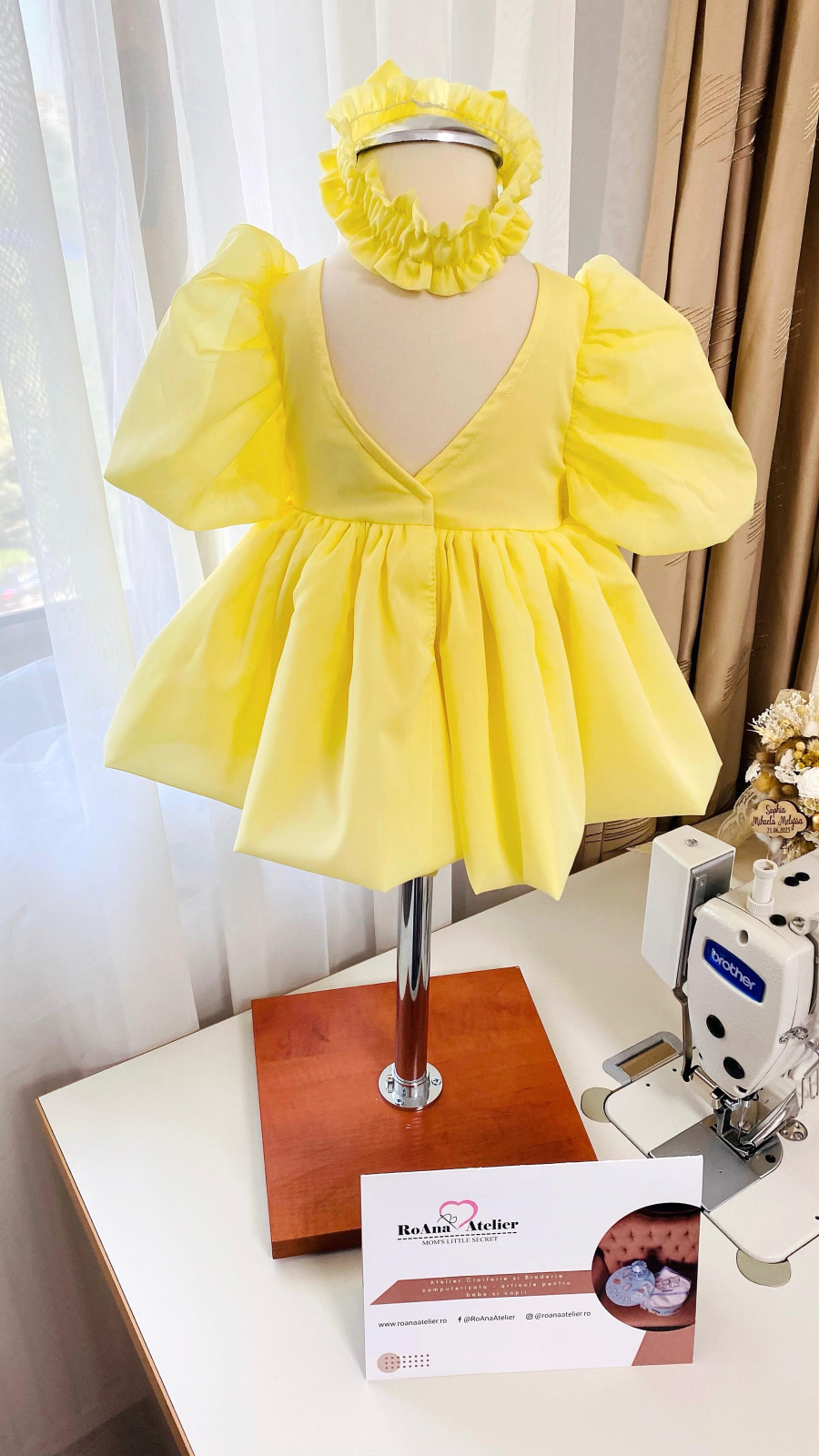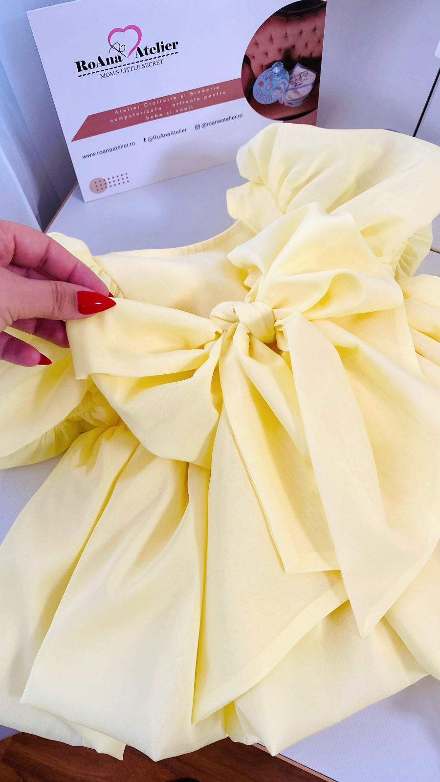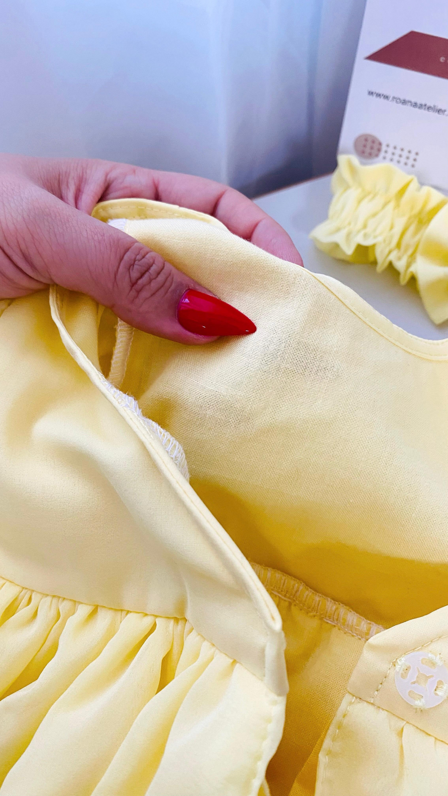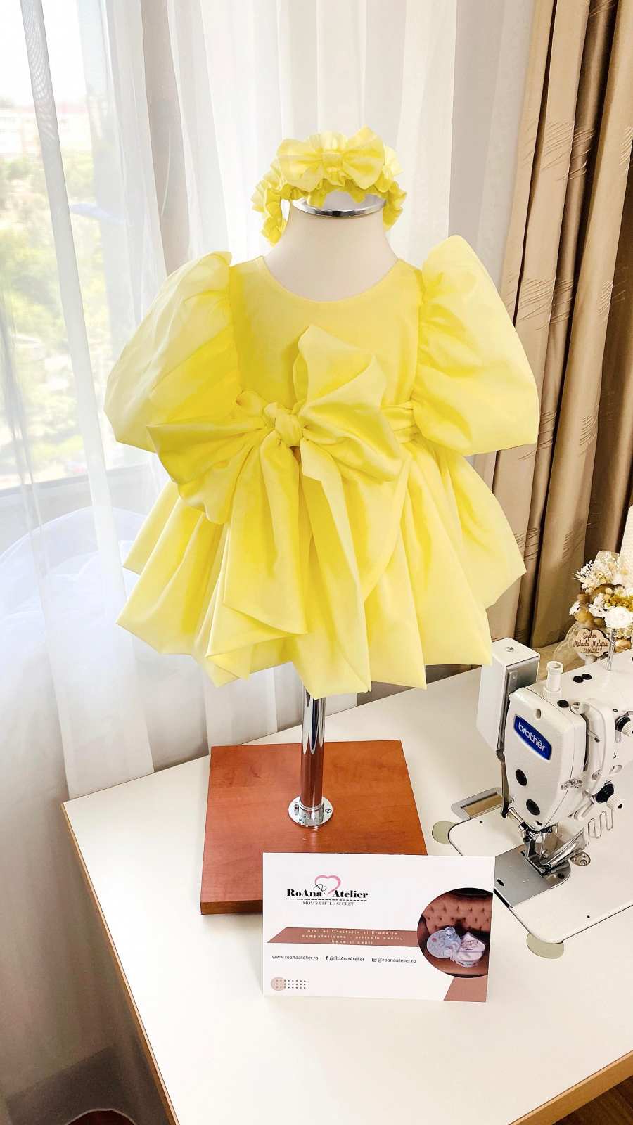 Cu o nuanță veselă și rafinată, galbenul lămâiță transformă această rochie într-o alegere perfectă pentru: Botez, evenimente în aer libe sau petreceri în sezonul cald.