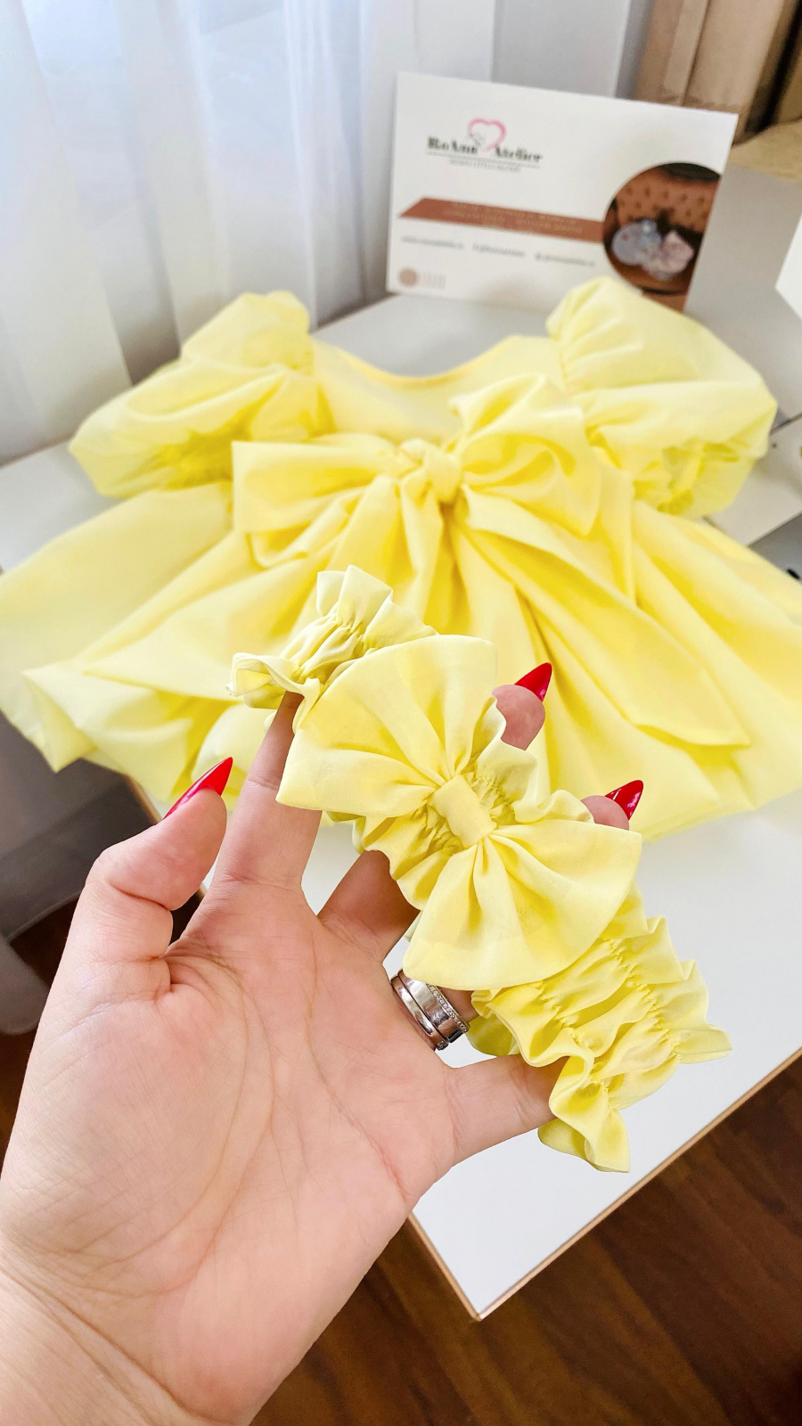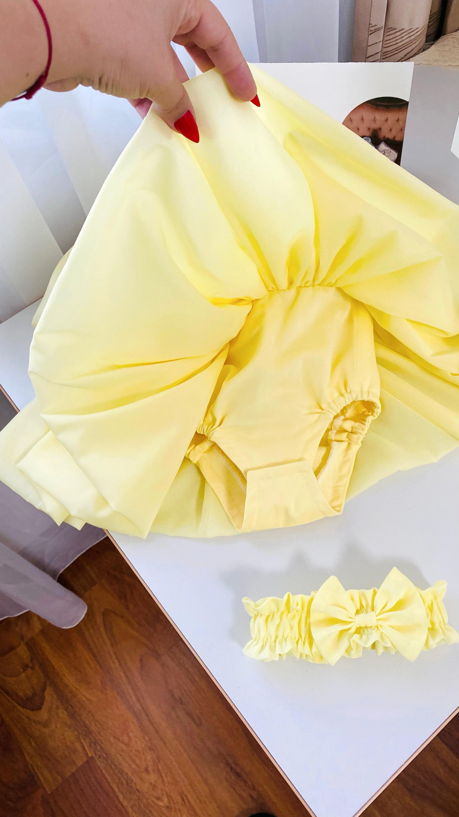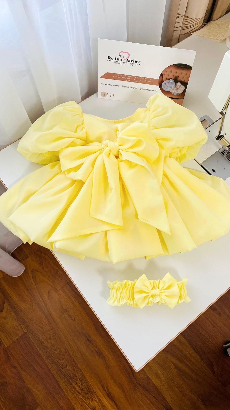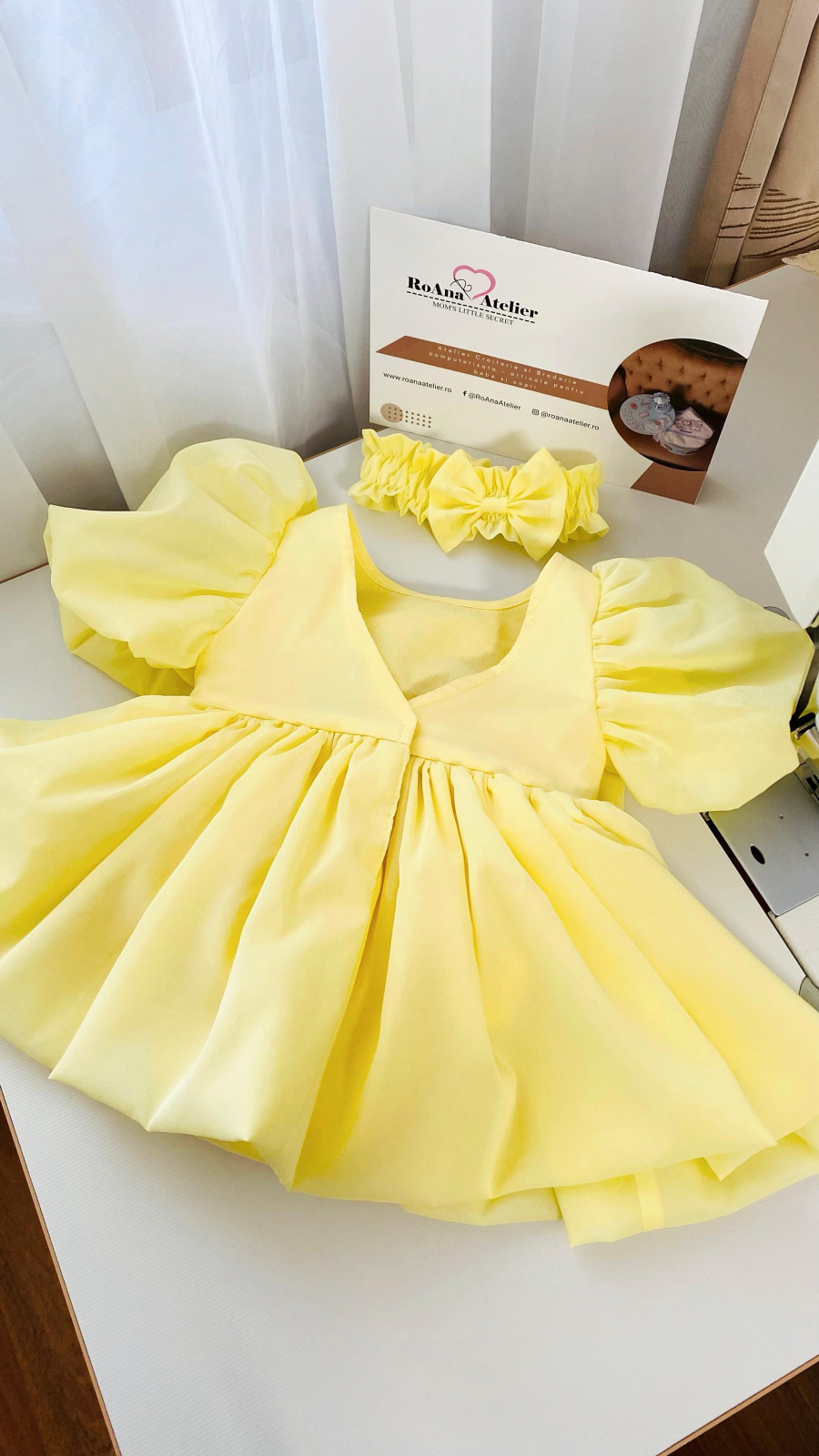 Cu o nuanță veselă și rafinată, galbenul lămâiță transformă această rochie într-o alegere perfectă pentru: Botez, evenimente în aer libe sau petreceri în sezonul cald.