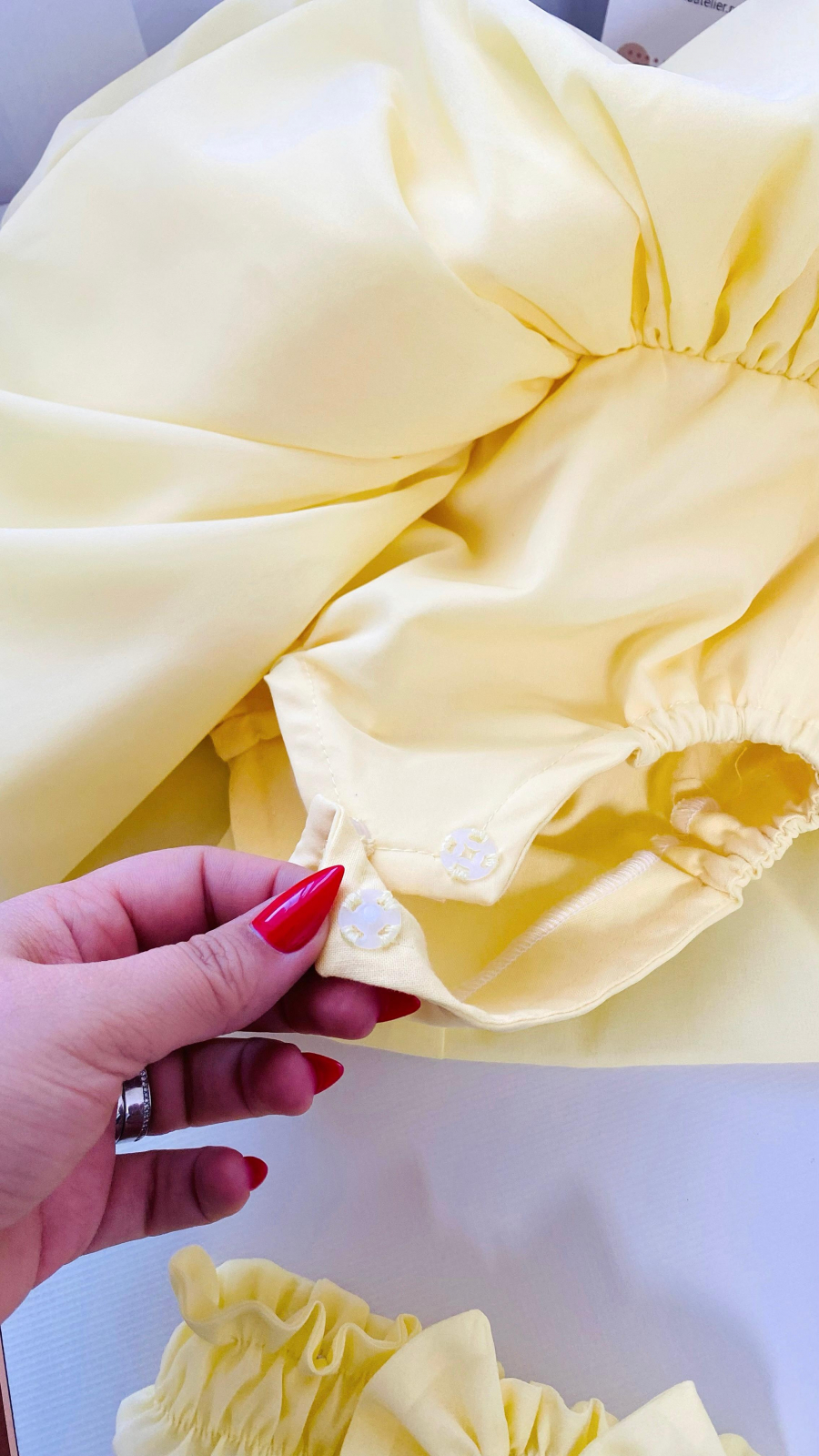 Melyssa este o rochiță de botez luminoasă și delicată, creată pentru bebelușele care aduc soare în sufletul tuturor. Confectionată din voal de mătase galben, cu un interior tip body și închidere cu capse, această rochiță cu o croială lejeră îmbină eleganța cu confortul absolut.