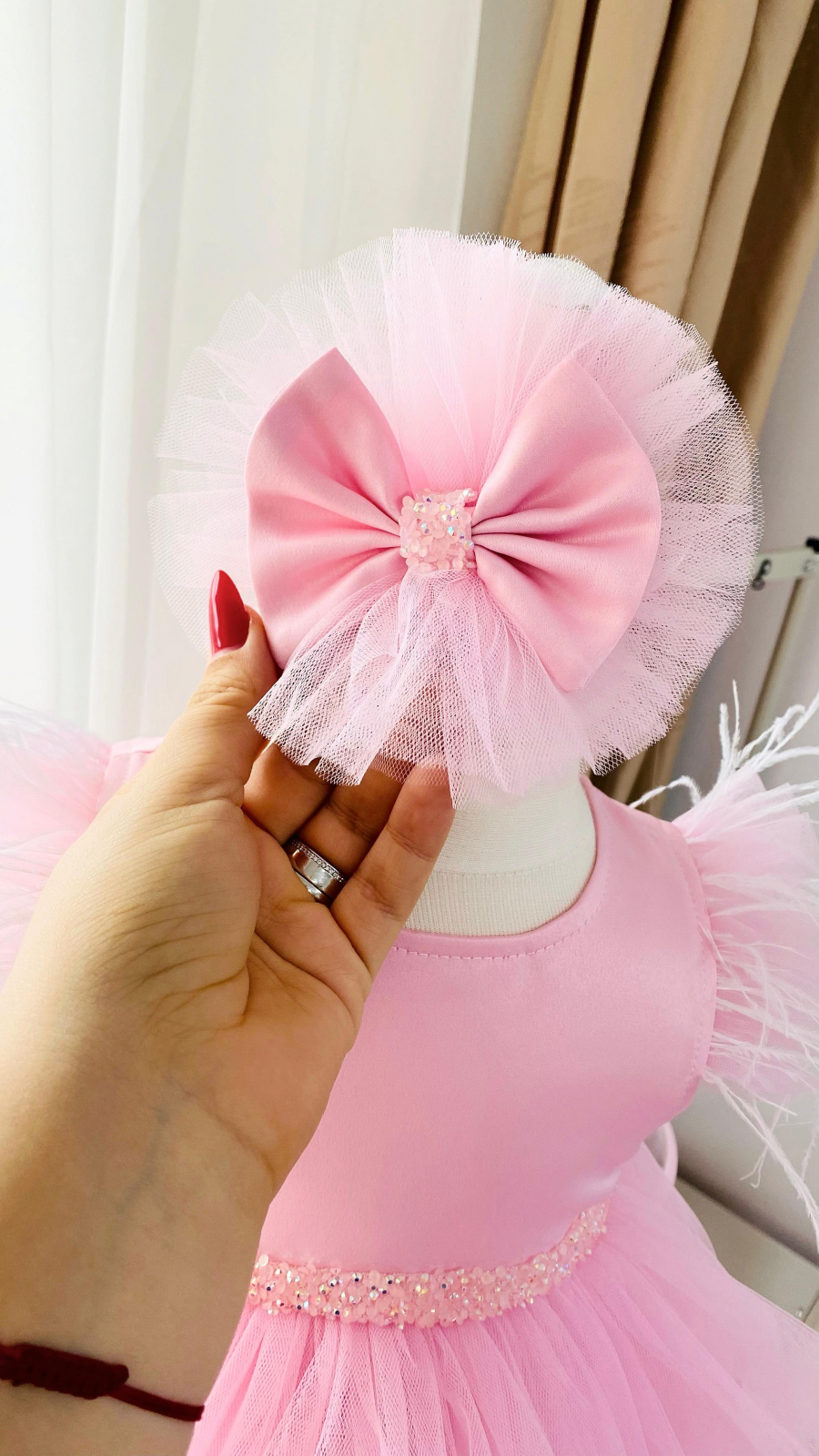 Rochita este tip printesa, cu fusta ampla din tulle intr-o nuanta dulce de roz, lucrata fara manecute, doar cu aripioare pe umeri din tulle si pene cusute pentru un efect diafan. Talia este accentuata de un brau cu cristale asortate stralucitoare. Se incheie la spate cu nasturei imbracati si este atasata o funda mare pentru o nota de eleganta. Pe mijlocul fundei sunt cusute cristalute asortate.