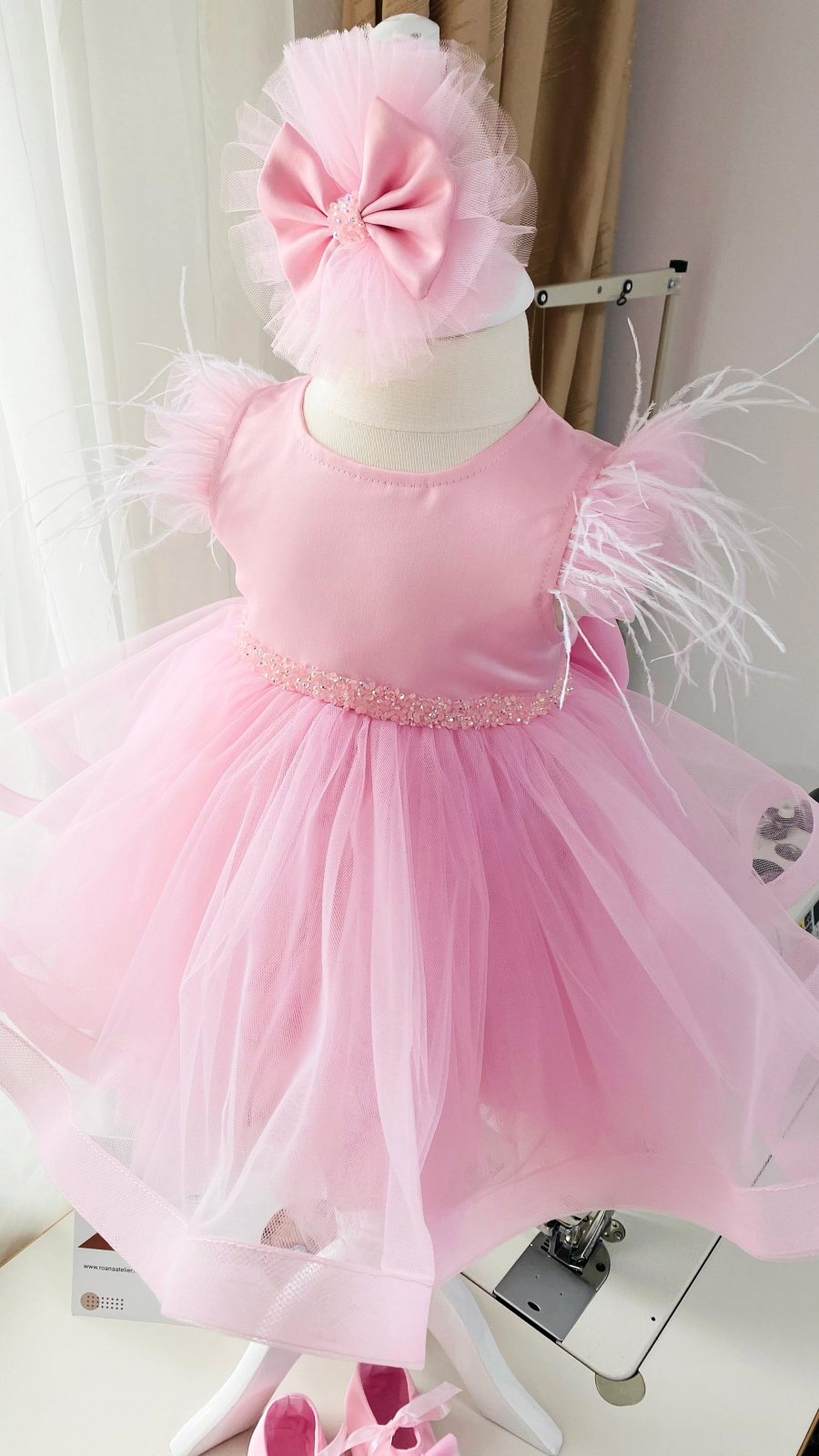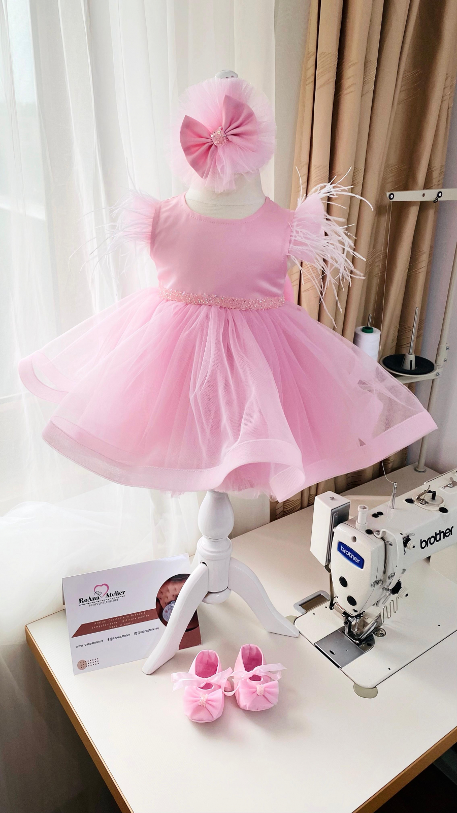 Set Rochiţă Botez Ada Roz format din 3 piese: rochita, bentita si botosei asortati. Piesele sunt lucrate din matasica, tulle premium si pene albe de struț.