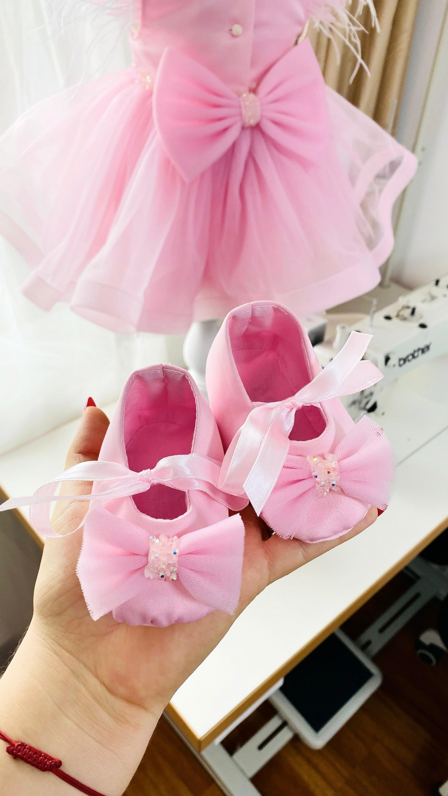 Botoseii sunt personalizati prin brodare pe talpa cu numele bebelinei si data botezului. Broderia poate fi de orice culoare. In poze s-a brodat cu ata roz trandafiriu.