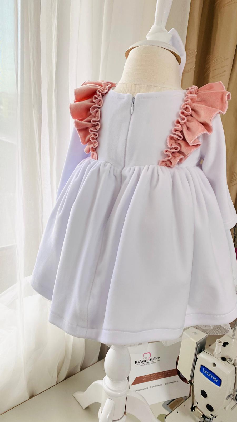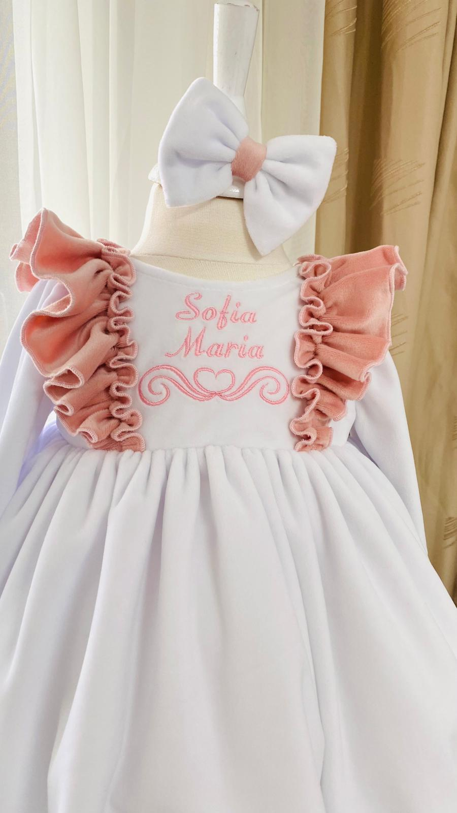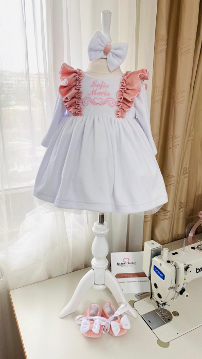 Set Rochita Botez Sonia din catifea alba si roz prafuit, format din rochita, bentita si botosei asortati.