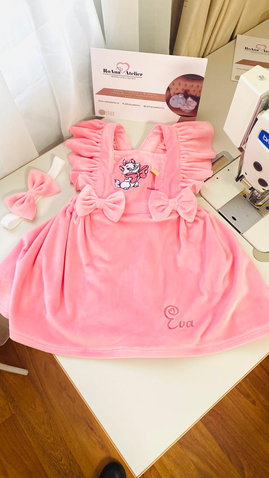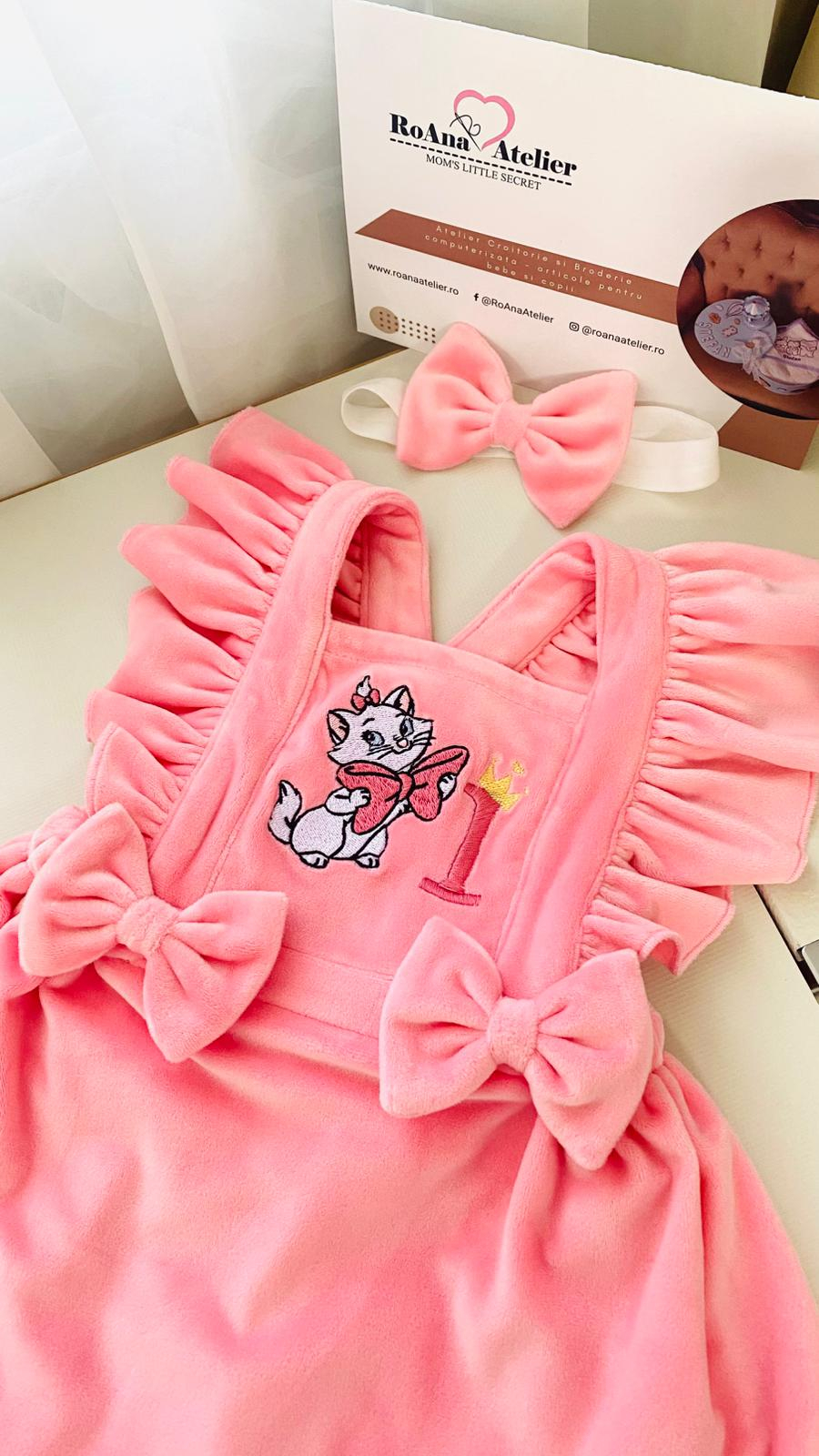 Realizat din catifea moale, în nuanță roz intens, sarafanul este decorat cu fundițe elegante și broderie cu tematica dorita la petrecere. Pe piept este brodată Pisica Marie și cifra 1 cu coronita, iar pe fustiță este personalizat cu numele fetiței, pentru un outfit unic și memorabil.