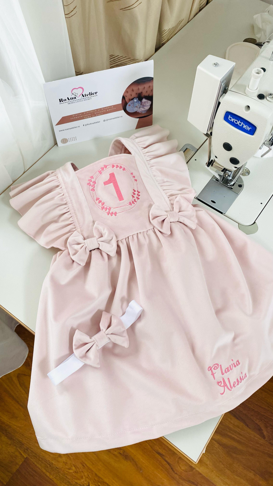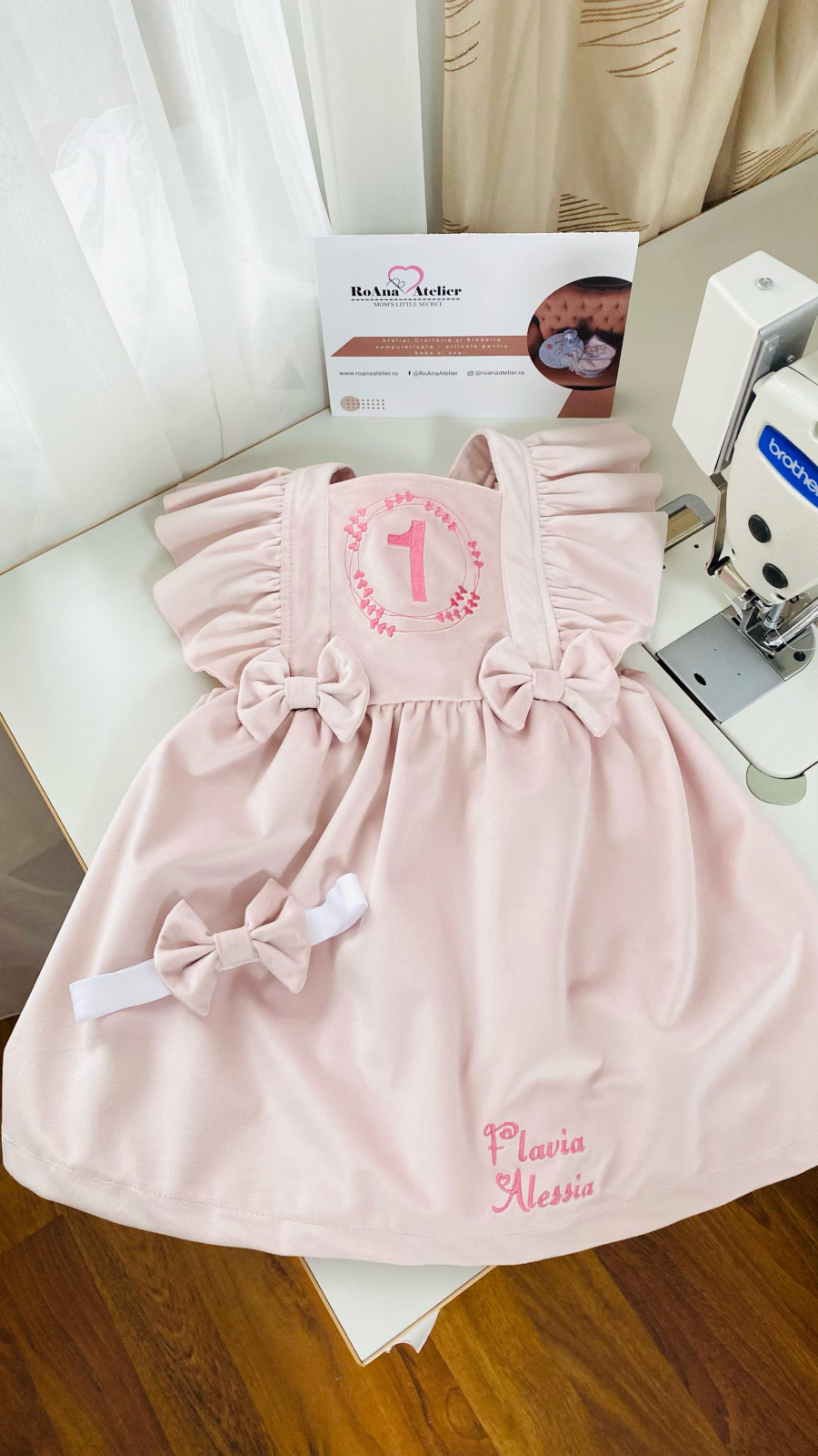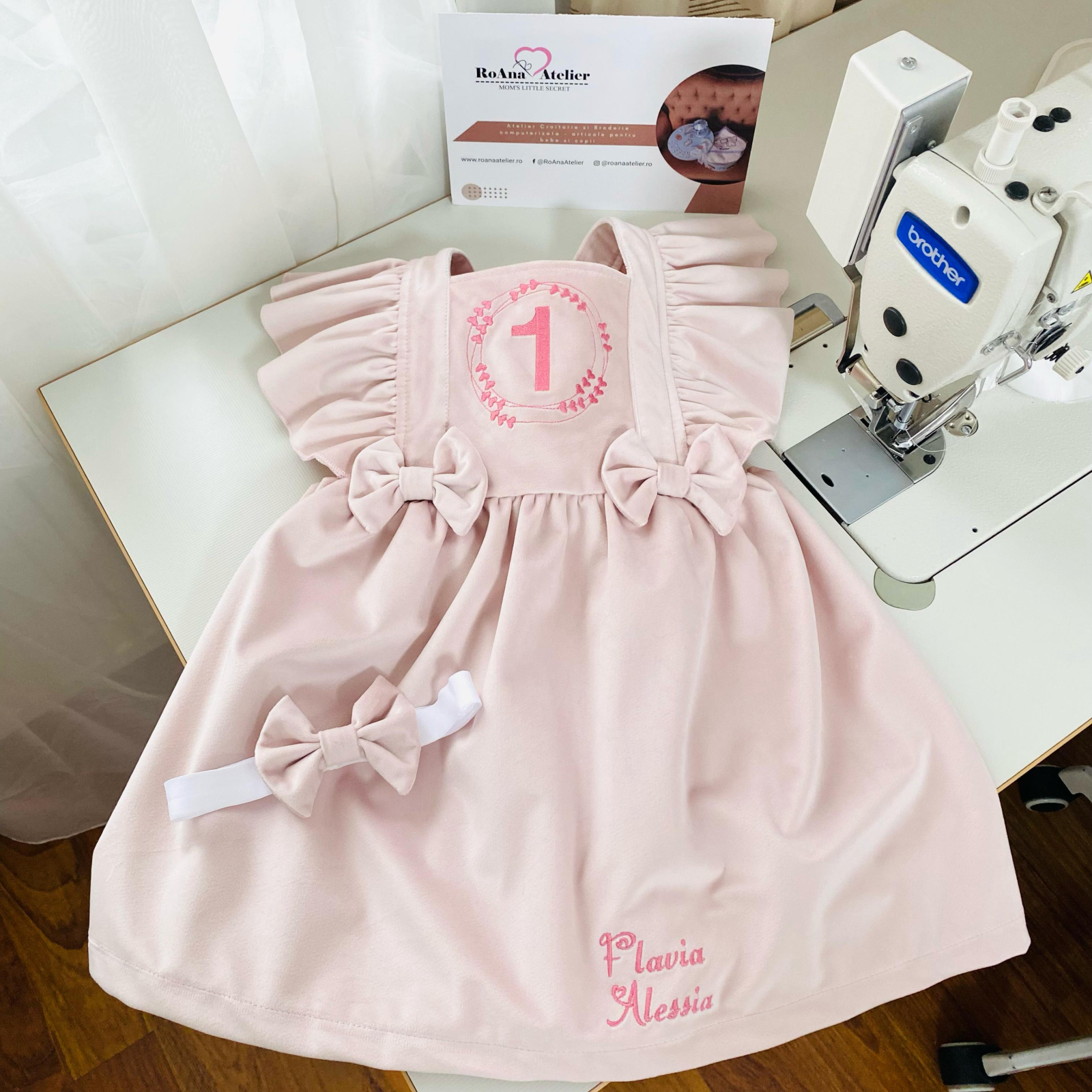 Sarafan roz prafuit 1 anisor inimioare confecționat din catifea premium într-o nuanță de roz prafuit, cu volane delicate pe umeri si fundite in talie. Pe pieptar este brodat cifra 1 intr-un frame cu inimioare, deoarece sarafanul este destinat pentru Aniversarea de 1 an a bebelinei.