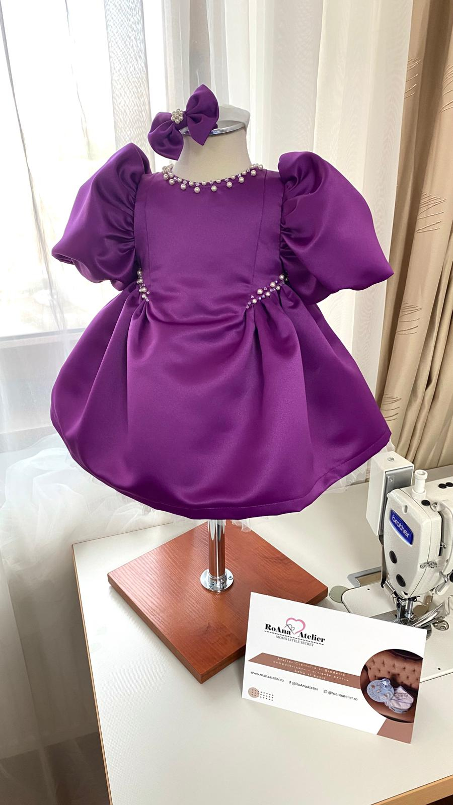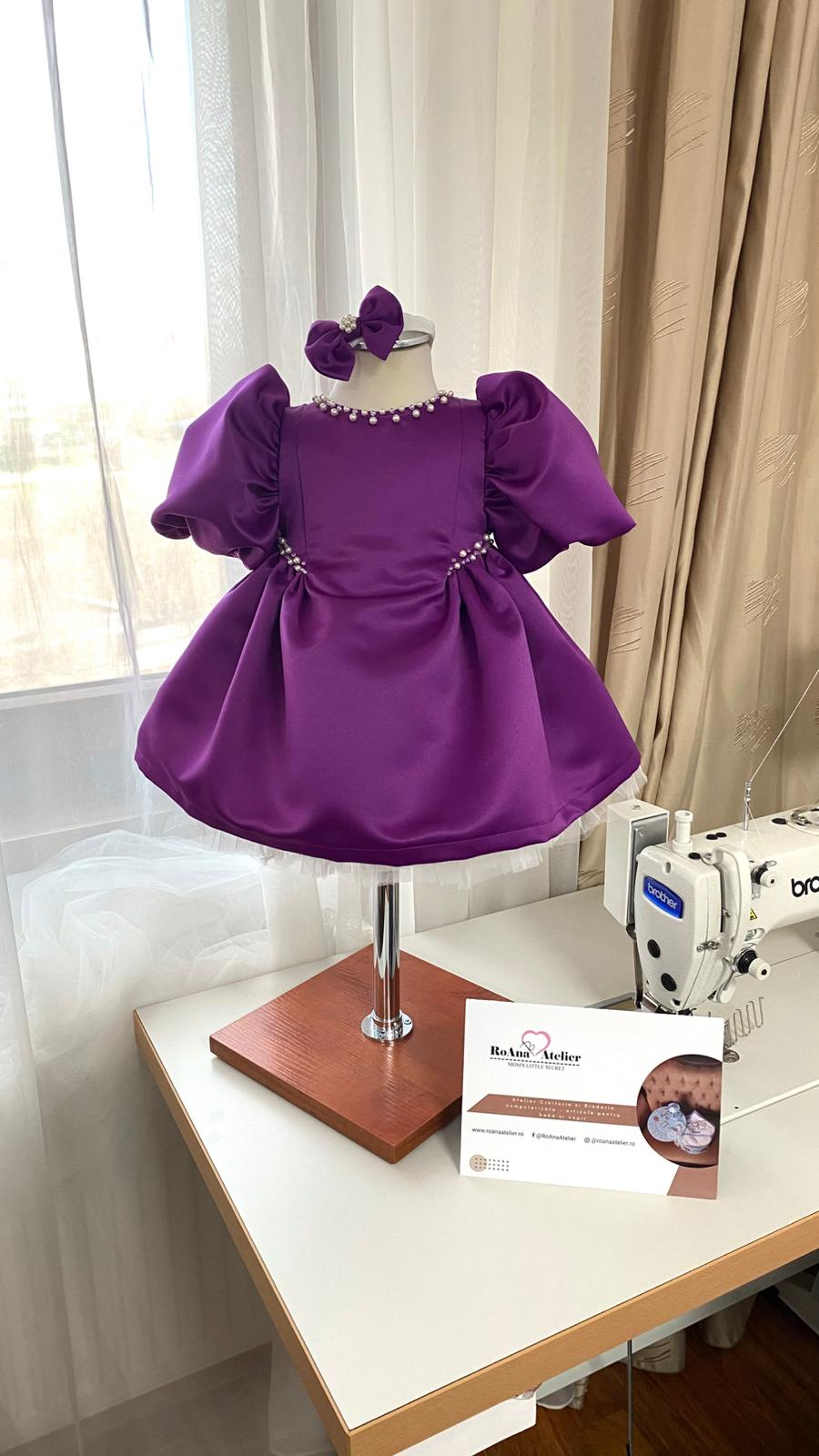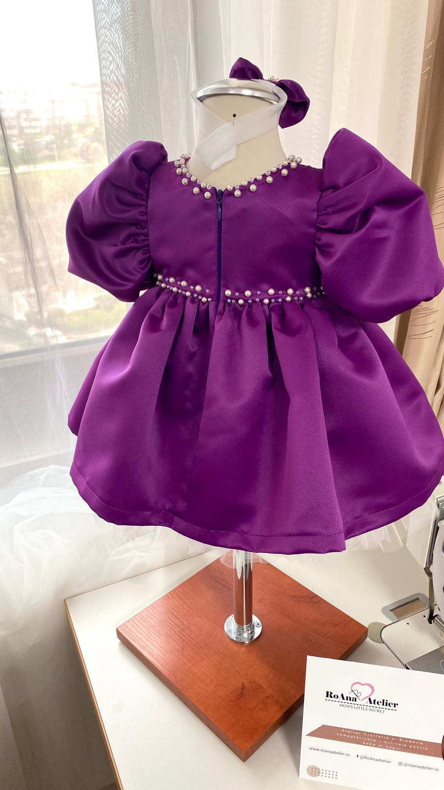 Rochita Botez Amira Mov este o rochiță elegantă pentru fetițe din tafta mov prună, cu un croi modern, accesorizata cu perle și cristale Preciosa, cusute manual – ideală pentru botez, aniversare sau evenimente speciale.