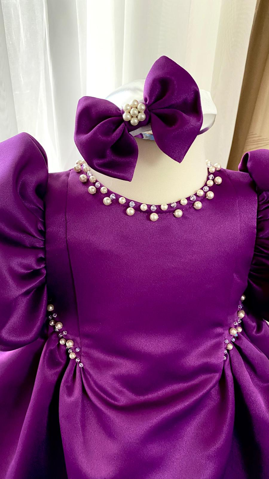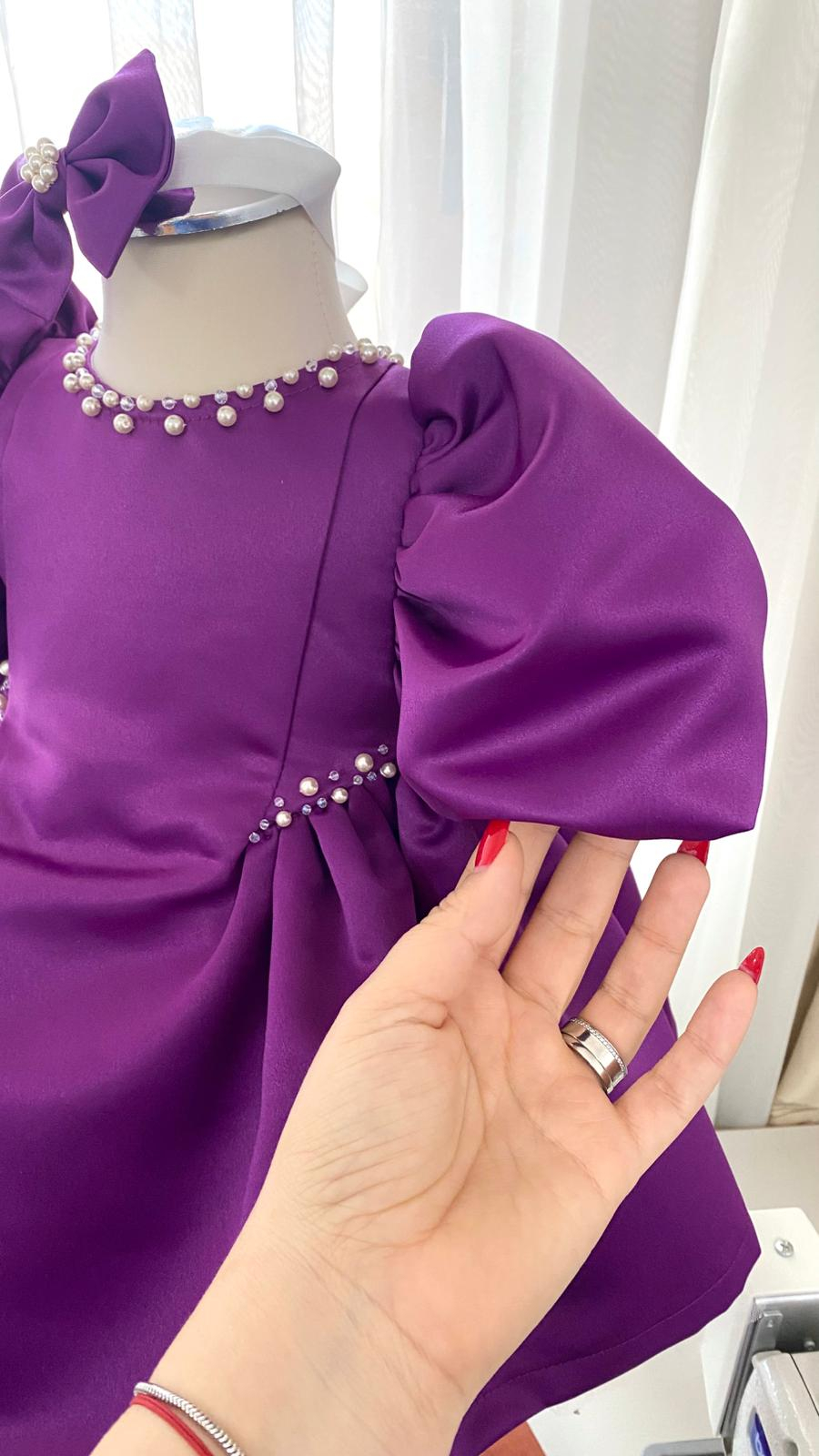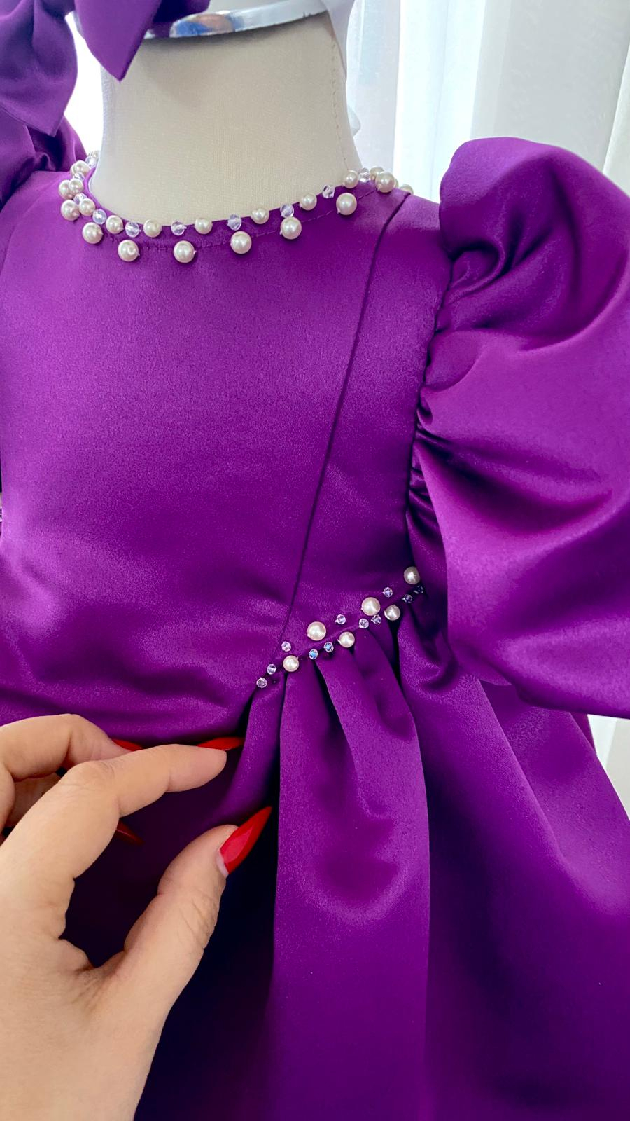 Rochita Botez Amira Mov este o rochiță elegantă pentru fetițe din tafta mov prună, cu un croi modern, accesorizata cu perle și cristale Preciosa, cusute manual – ideală pentru botez, aniversare sau evenimente speciale.