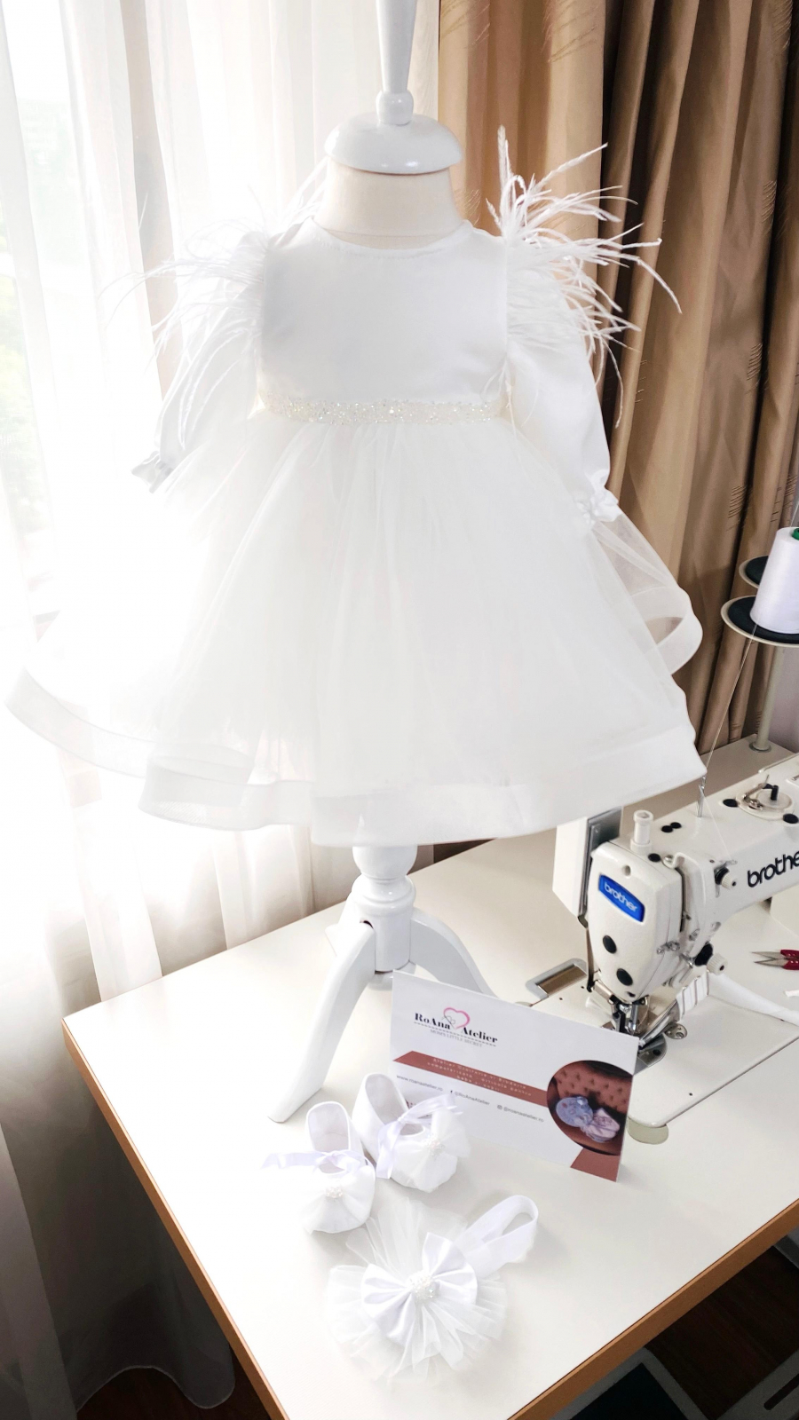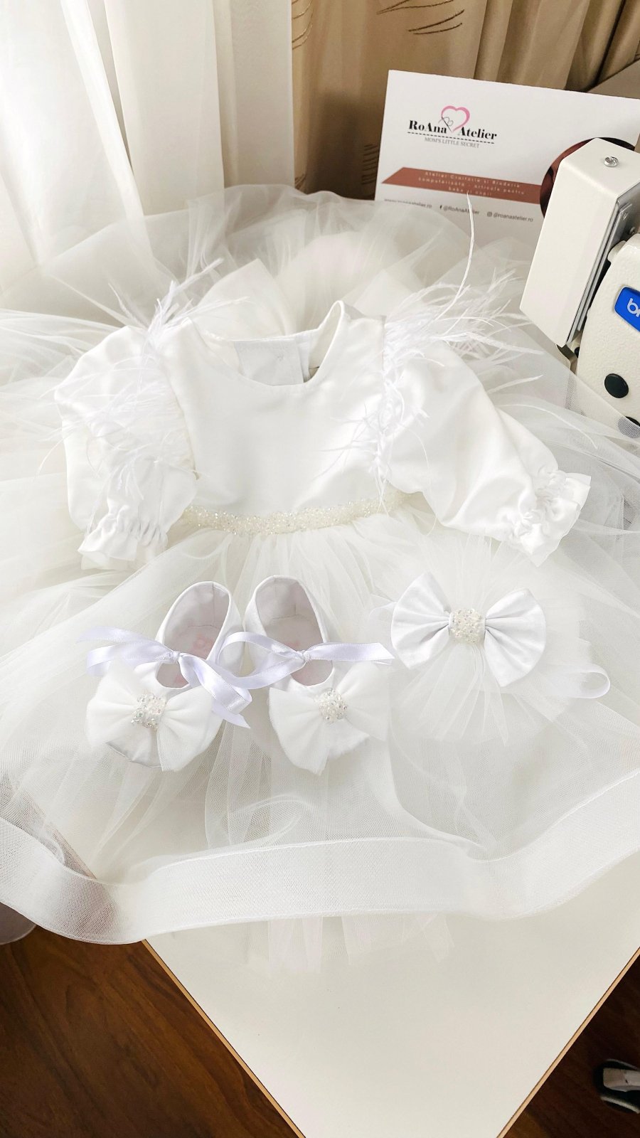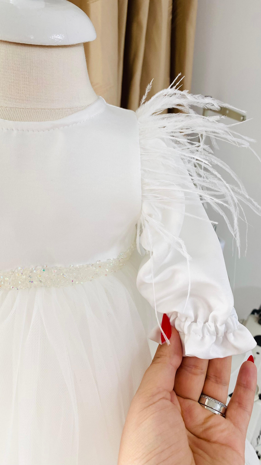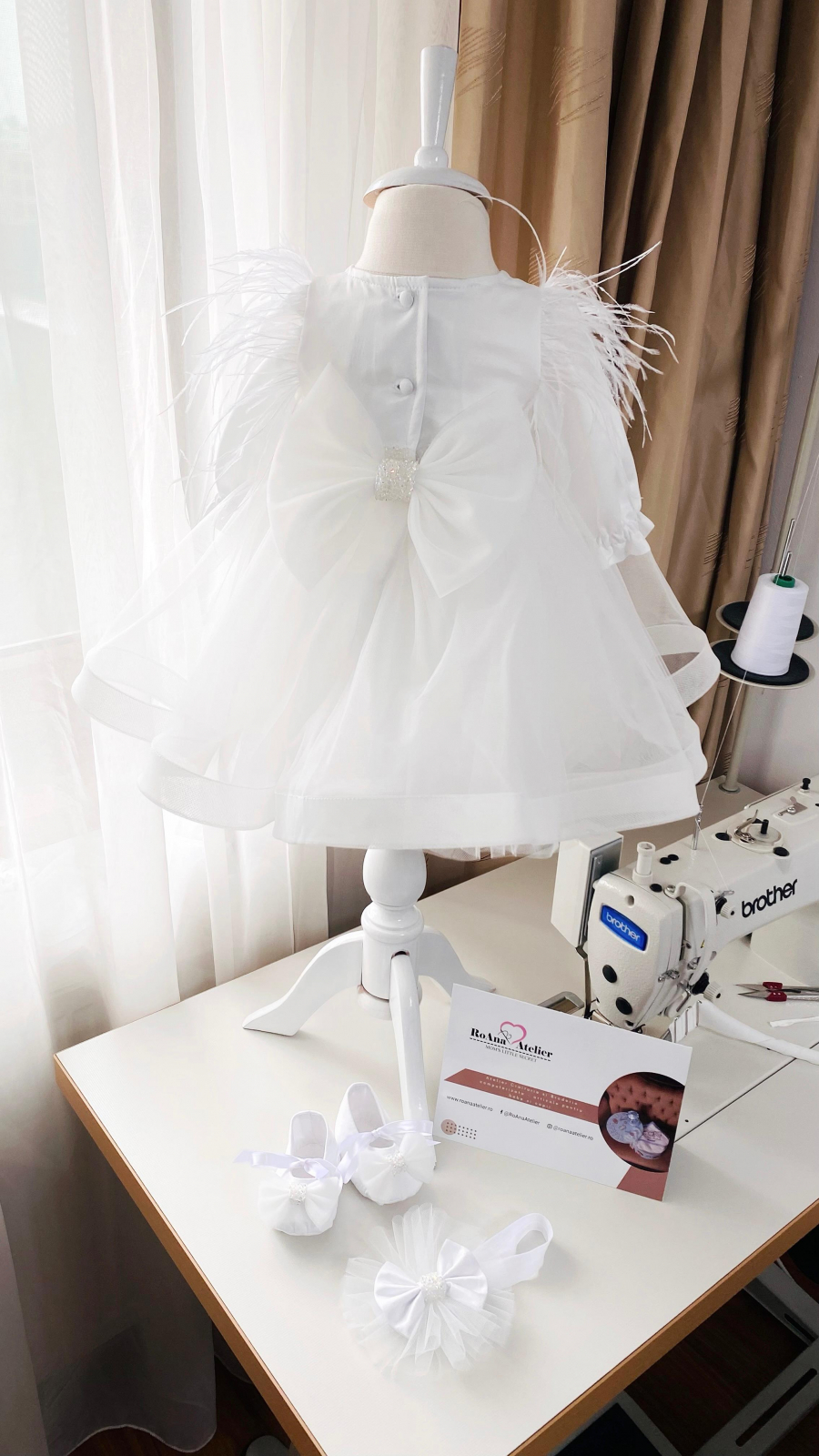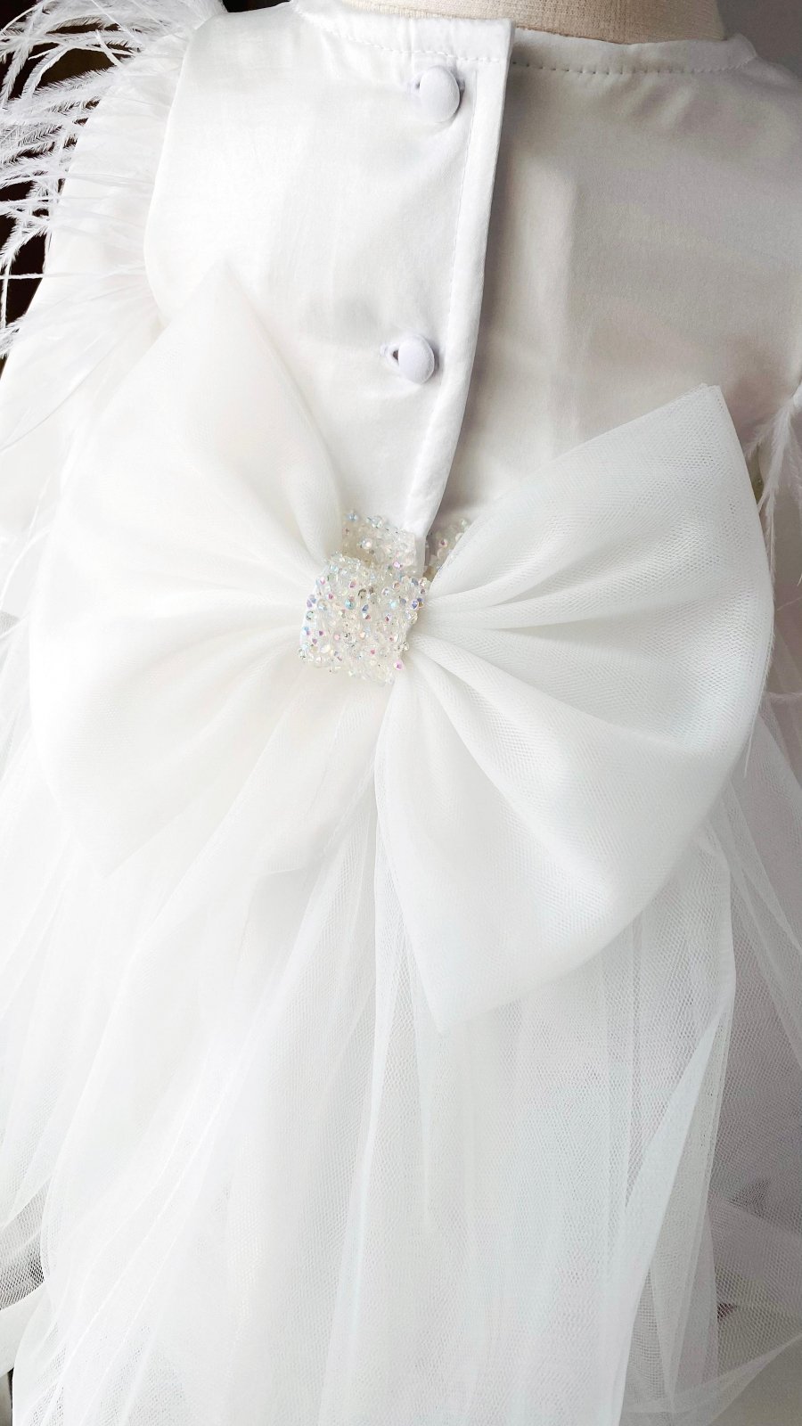 Set Rochiţă Botez Ada alba format din 3 piese: rochita, bentita si botosei asortati. Piesele sunt lucrate din matasica, tulle premium si pene albe de struț. Penele sunt cusute pe umeri pentru un efect diafan. Acestea se continua si pe spate.