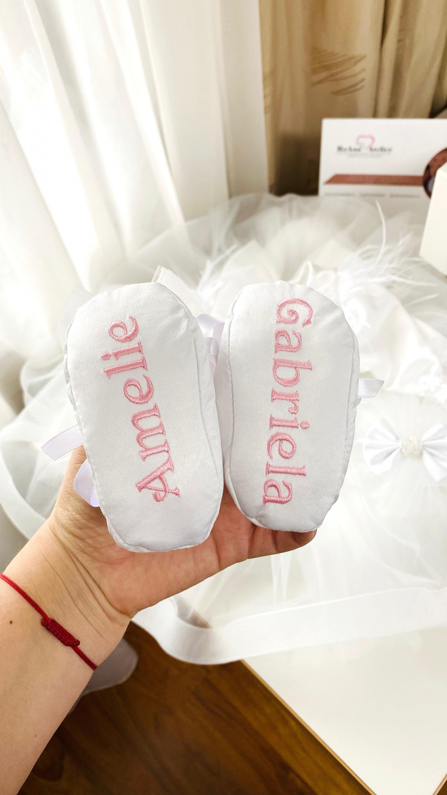 Botoseii sunt personalizati prin brodare pe talpa cu numele bebelinei. Broderia poate fi de orice culoare. In cazul acesta este roz.