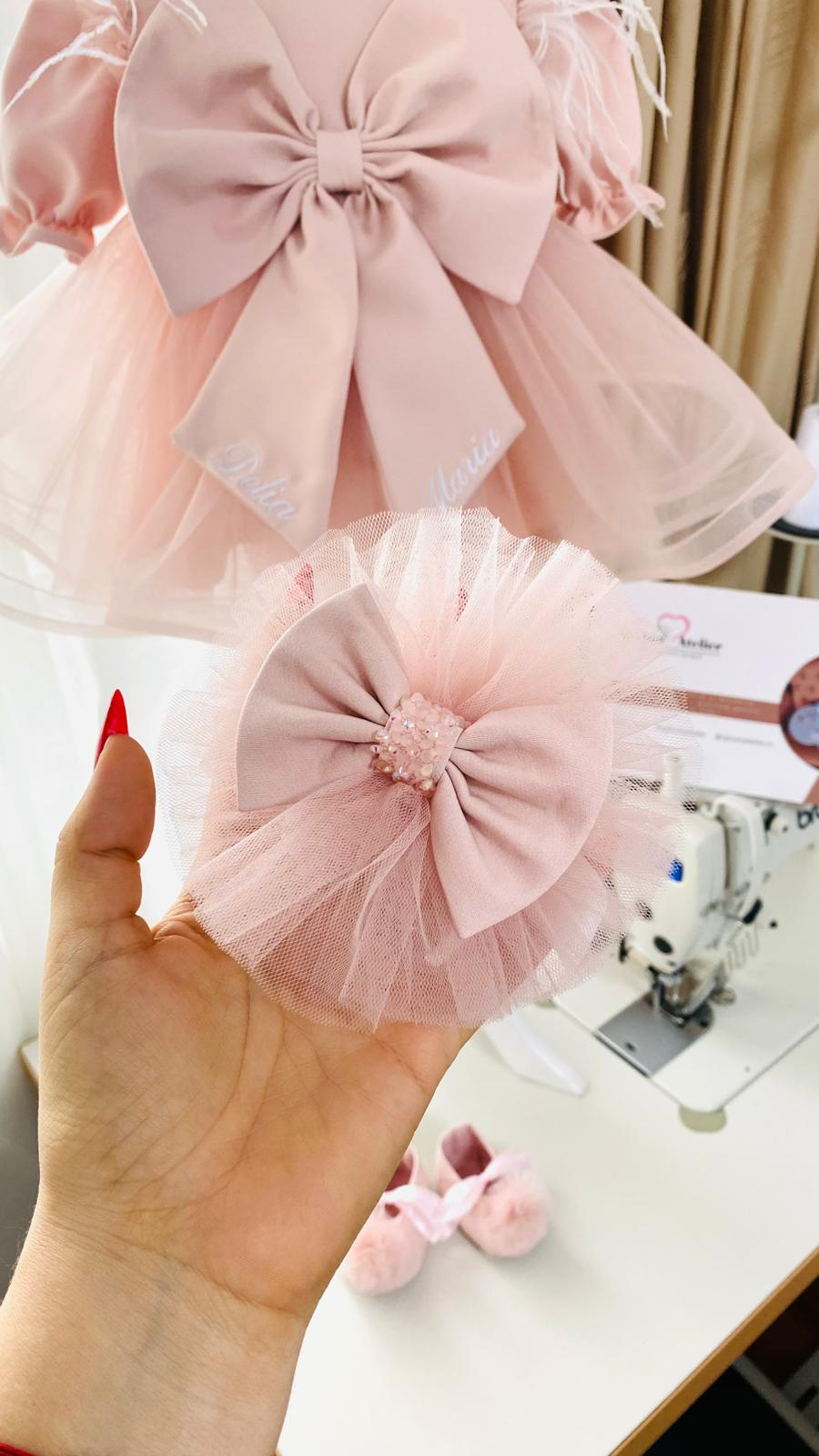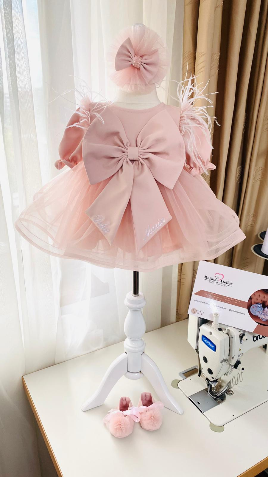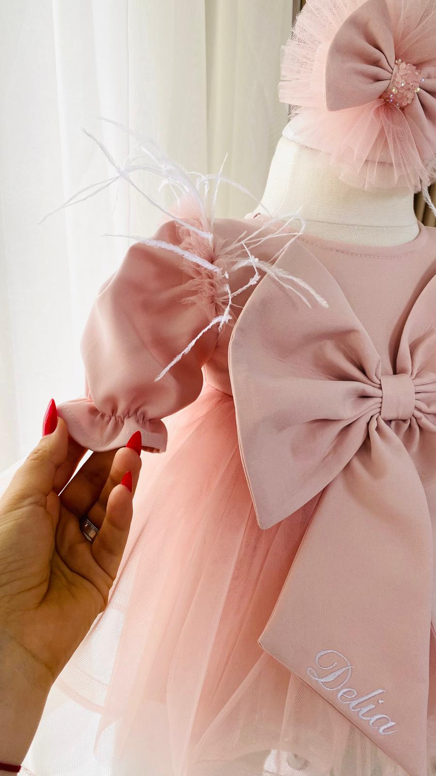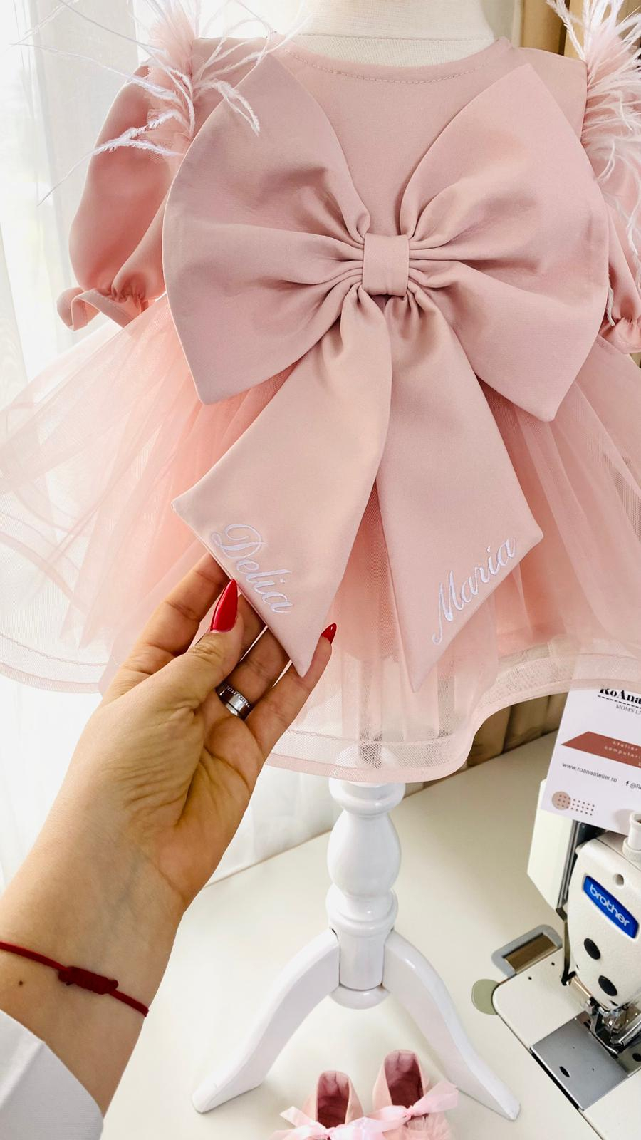 Rochiță din stofiță moale roz pudra / roz prafuit si fustita din tulle asortat, cu o fundă supradimensionată brodată cu numele fetiței. Penele sunt cusute pe umeri pentru un efect diafan. Se incheie la spate cu nasturei imbracati. Numele este brodat cu ata alba - se poate si cu o alta culoare;