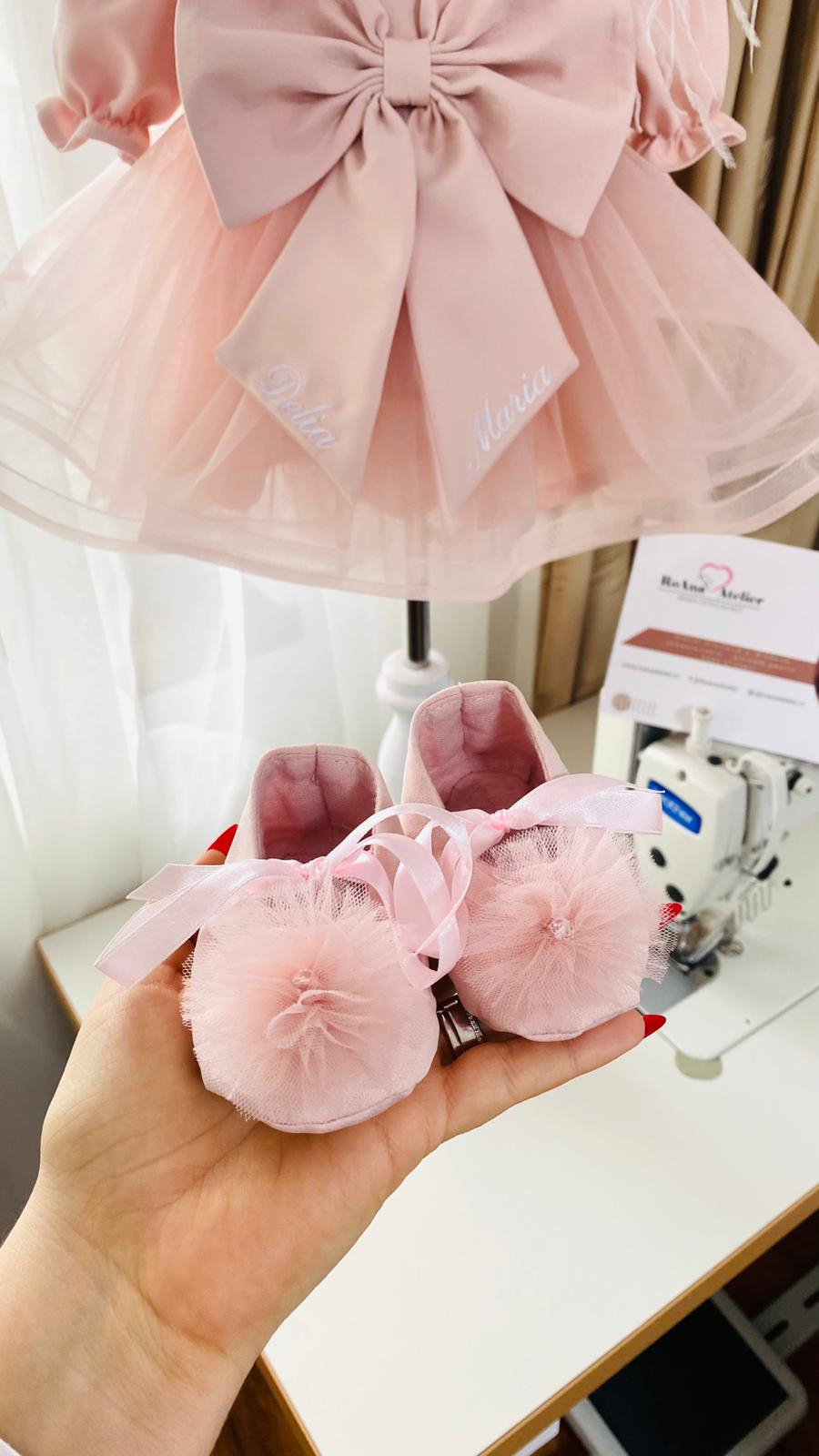 Botoșei din stofiță moale, cu floricica din tulle fin. Botoseii se pot personaliza cu numele micuței si data botezului. Broderia poate fi de orice culoare.