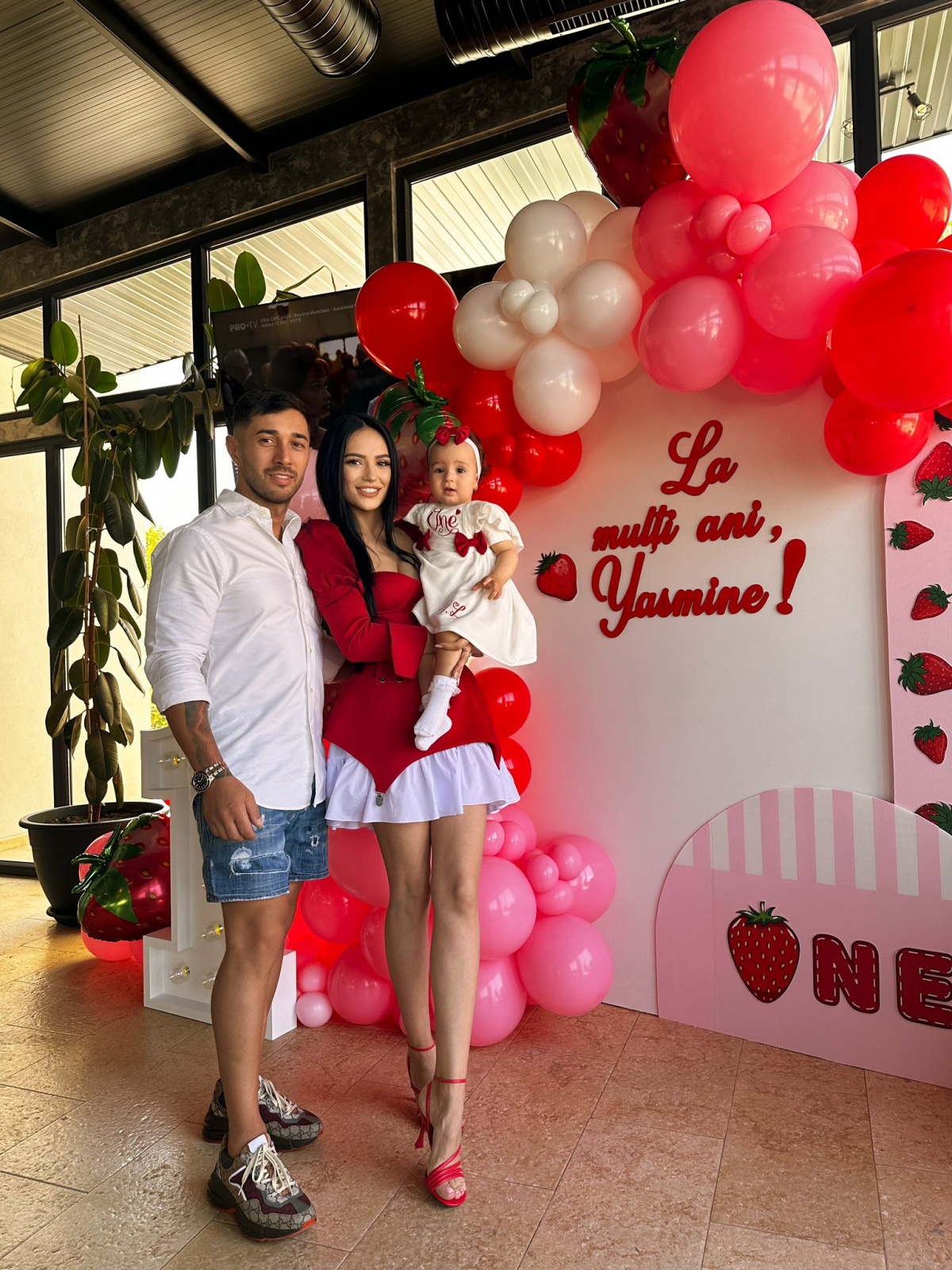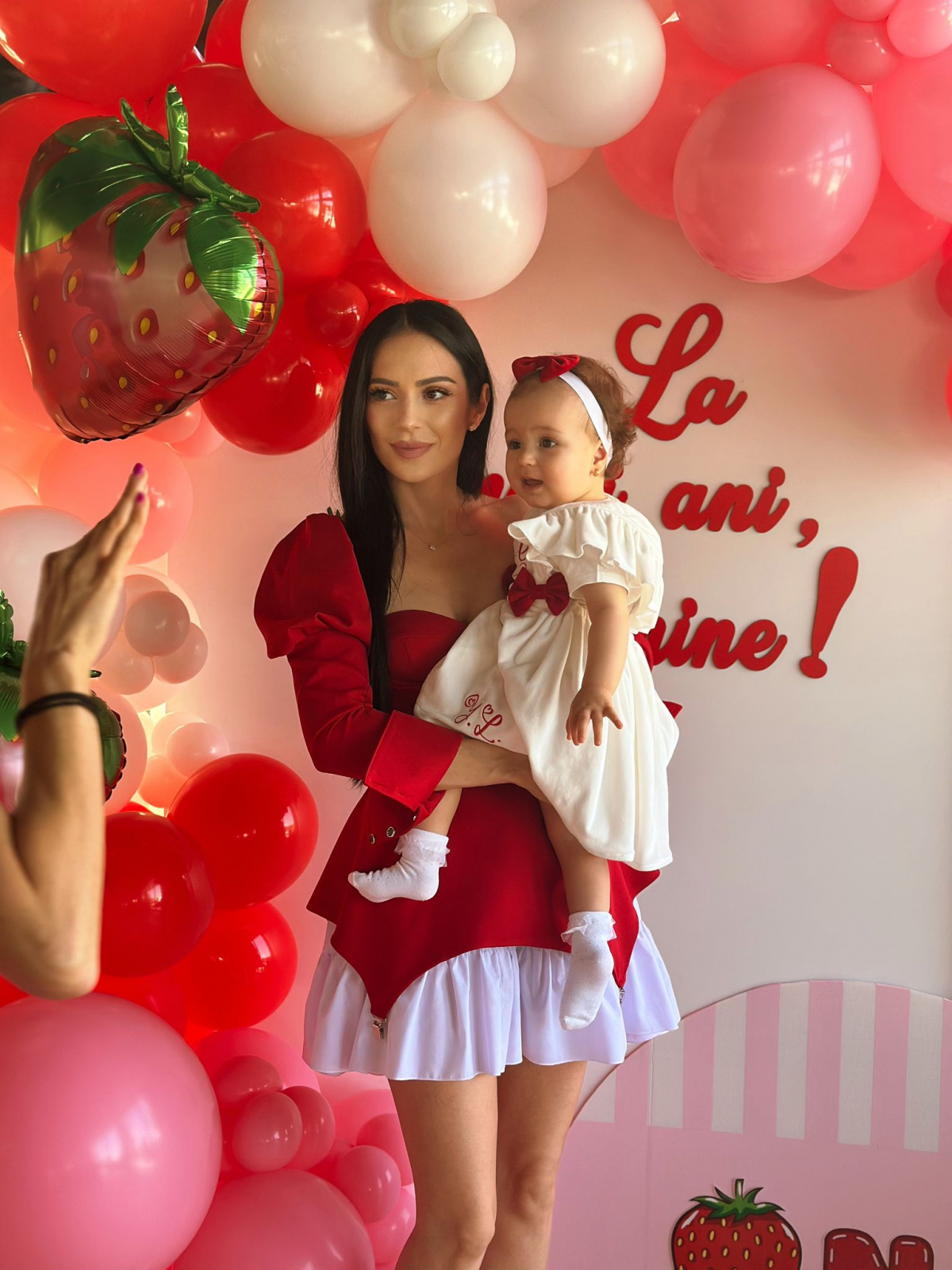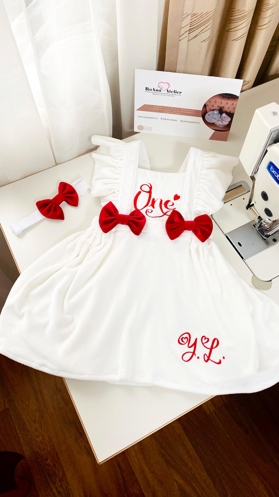 Pe pieptar este brodat cu rosu "One" deoarece sarafanul este destinat pentru Aniversarea de 1 an a bebelinei.