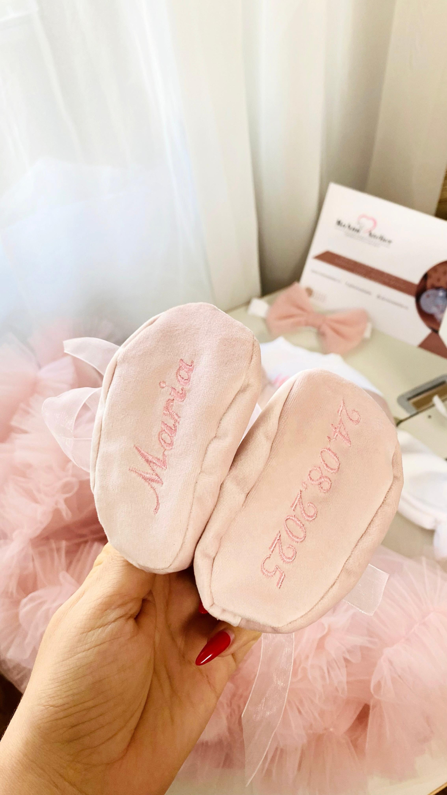 Botosei Personalizati: Ultima atingere de rafinament, botoseii sunt din catifea roz prafuit, personalizați pe talpa cu inițialele micuței, oferind un detaliu subtil și memorabil.