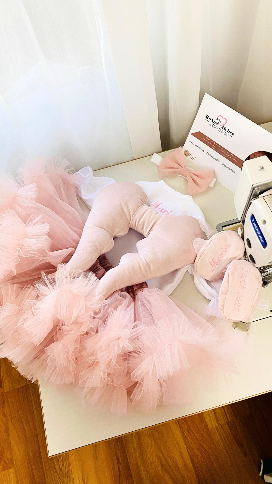 Fustița Tutu Roz: o fustiță plină de farmec, cu volum, realizată din tulle moale într-o nuanță dulce de roz prafuit (roz vintage), cu elastic in talie.